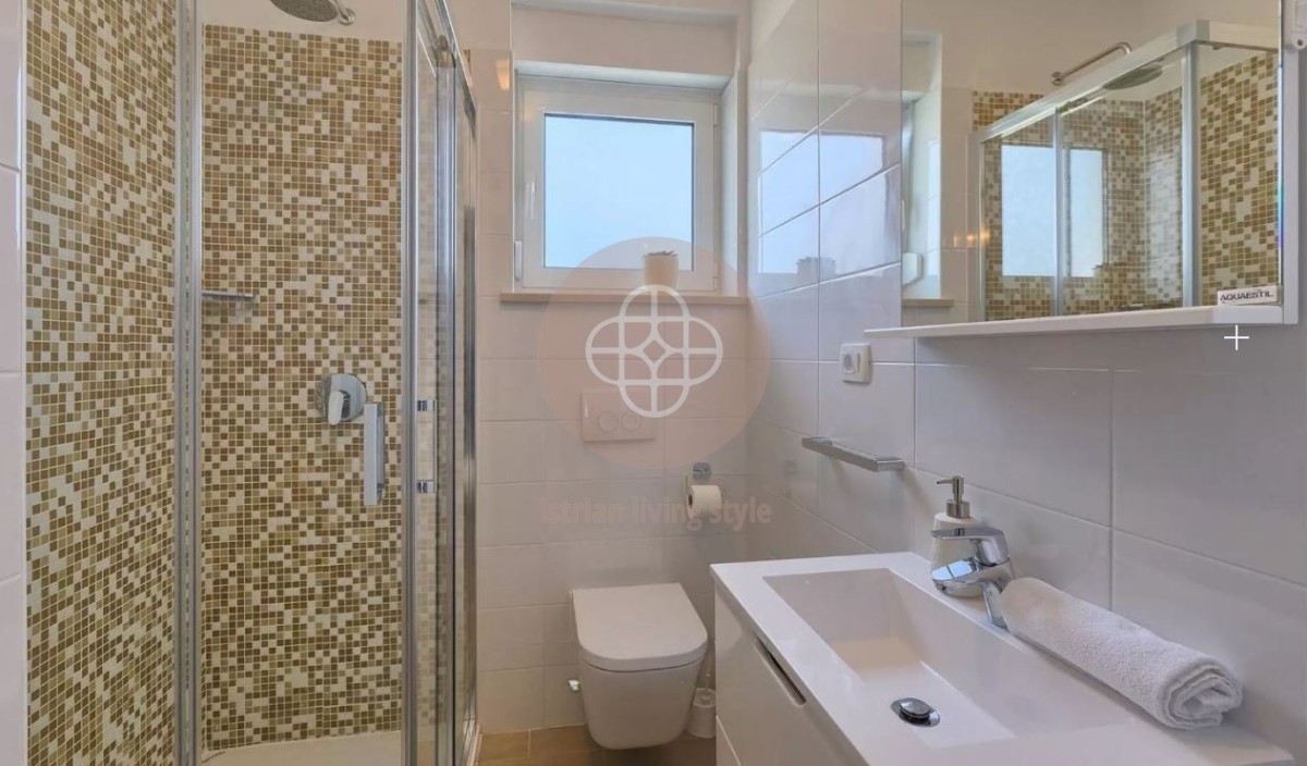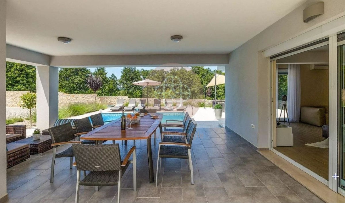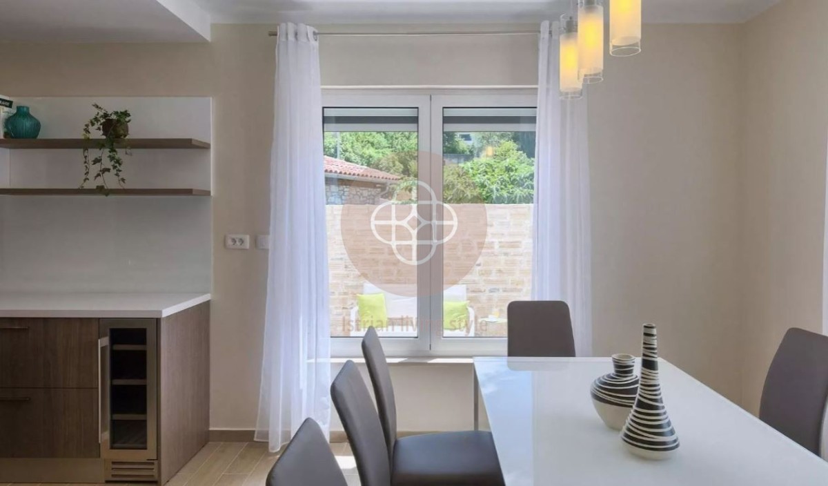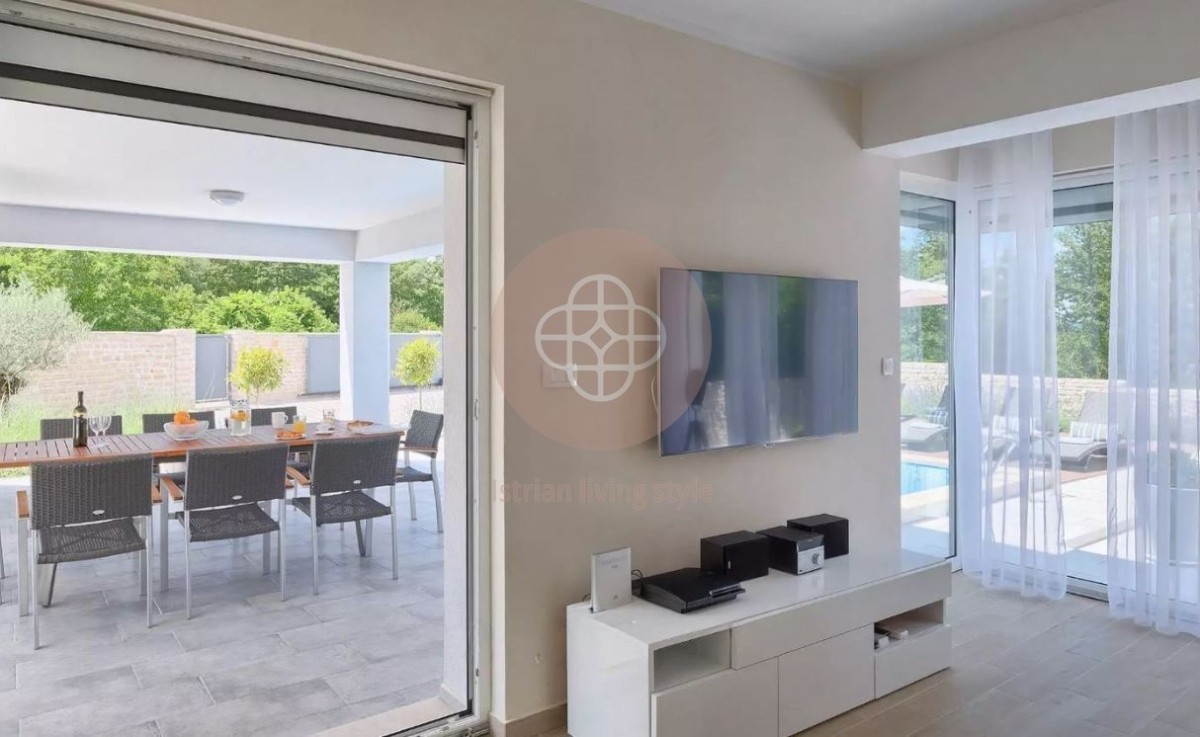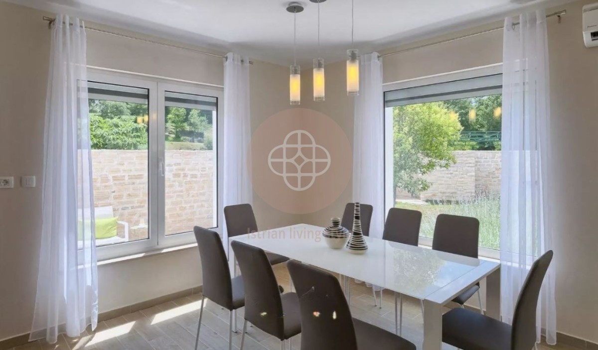 ISTRIEN – KRŠAN: Eine stilvolle, moderne Oase erwartet Sie in Form einer atemberaubenden Villa, gelegen in einer urbanen Umgebung, mit einem weitläufigen Garten, einem erfrischenden Pool und einer verwöhnenden Sauna. Dies idyllische Refugium lockt nur knapp 7 km entfernt, nur einen Katzensprung von dem nächsten sonnenverwöhnten Strand entfernt.