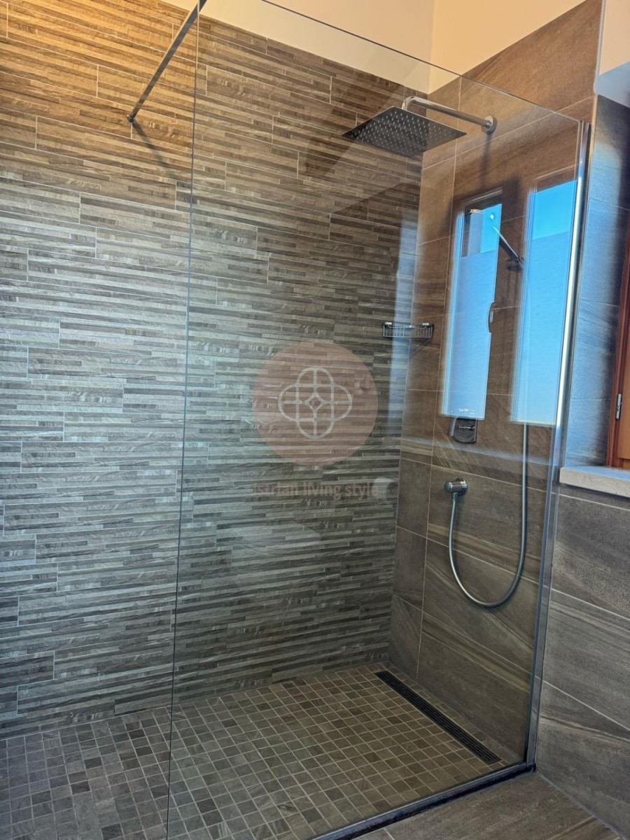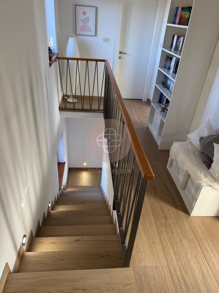 Betreten wir nun dieses zauberhafte Haus: rechts neben der Eingangstüre befindet sich ein Gäste WC mit Fenster. Einige Schritte weiter führen uns nun in den großzügigen, lichtdurchfluteten Wohn-Essbereich mit einer angeschlossenen offenen, sehr schicken Küche. Die große Fensterfront bietet somit einen herrlichen Blick auf den wunderschöne Gartenbereich, die Poolebene und das tiefblaue Mittelmeer. Ein Ausblick zum Verlieben. Auf dieser Ebene befindet sich zudem ein kleines Vorratskammerl mit Waschmaschinen Anschluss. über die Treppe erreichen wir nun das Obergeschoss: zwei Schlafzimmer mit jeweils einem Bad, ein Büro ( welches natürlich ebenfalls ein Schlafzimmer werden kann ) teilen sich diese Ebene. Alle Zimmer verfügen über einen Balkon als herrliche Rückzugsmöglichkeit mit uneingeschränkten Blick auf das Mittelmeer.