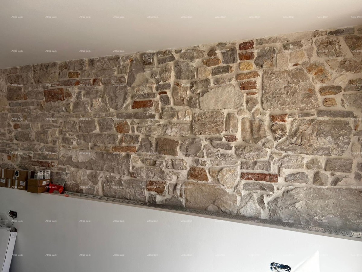 Im Erdgeschoss wird es einen separaten Teil geben, einen Flur, von dem aus Sie das Wohnzimmer mit Esszimmer betreten können. Unten befindet sich die Toilette, auf der rechten Seite gelangt man in die Küche, die zwar ein separater Raum ist, aber offen bleibt, also mit dem Wohnzimmer verbunden ist. Die Wände wurden im rustikalen Stil aus istrischem Stein belassen. Hochwertige Keramik in Wohnzimmer und Küche, Bad, WC und Fluren. Im Wohnzimmer gibt es einen Kamin und in der Küche gibt es einen kleinen Abstellraum, in dem Sie Holz für den Kamin usw. lagern können. Sie können diesen Abstellraum auch durch einen weiteren Eingang an der Seite betreten. Im Wohnzimmer und in den Zimmern wird es eine Klimaanlage geben.