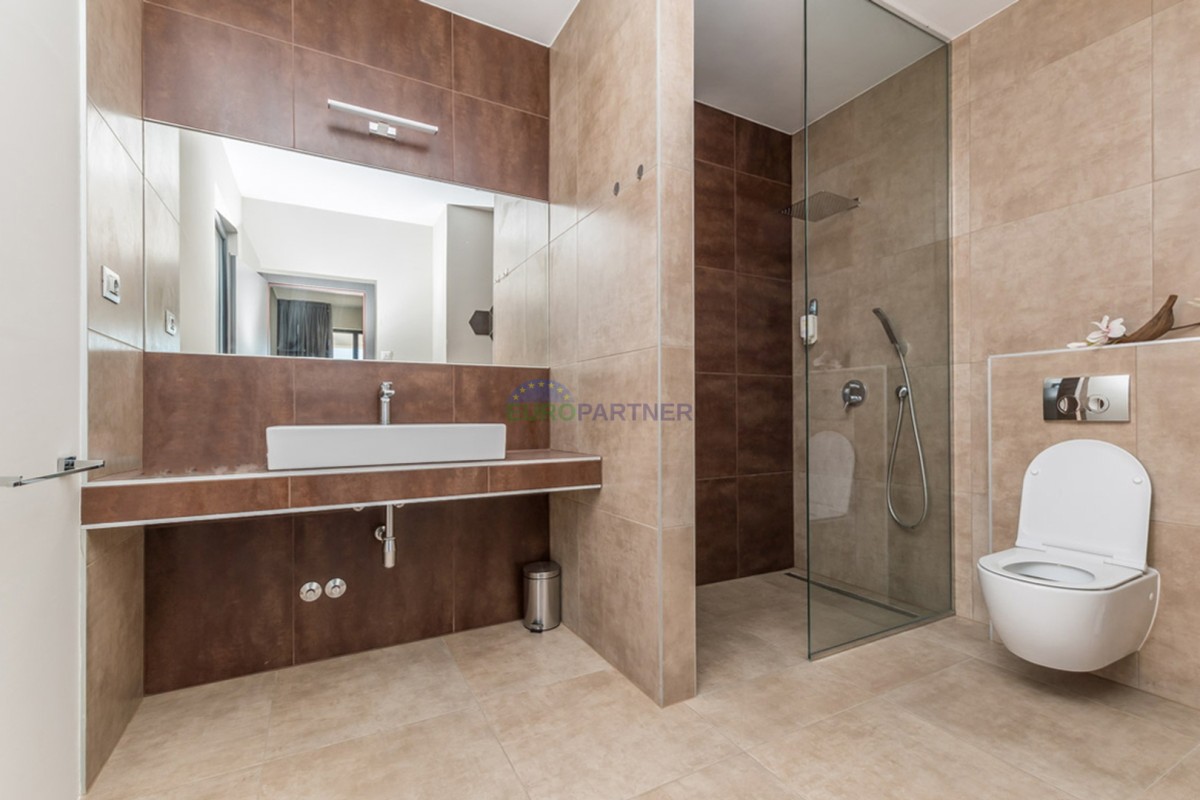 Das Erdgeschoss wird von einem großzügigen Open Space dominiert, der eine Eingangshalle, Gäste-WC und Speisekammer mit separatem Eingang sowie eine moderne Küche, ein Esszimmer und ein elegantes Wohnzimmer mit Kamin vereint. Als nächstes treffen wir auf das Hauptschlafzimmer mit einer modernen Badewanne in der Mitte des Raumes und einem separaten Badezimmer mit Dusche. Ein unverzichtbarer Bestandteil dieser wunderschönen Villa sind die großen Glaswände zwischen Innen und Außen, die es Ihnen ermöglichen, den Alltag mit dem Außen zu verbinden und so ein angenehmes Ganzes zu bilden.