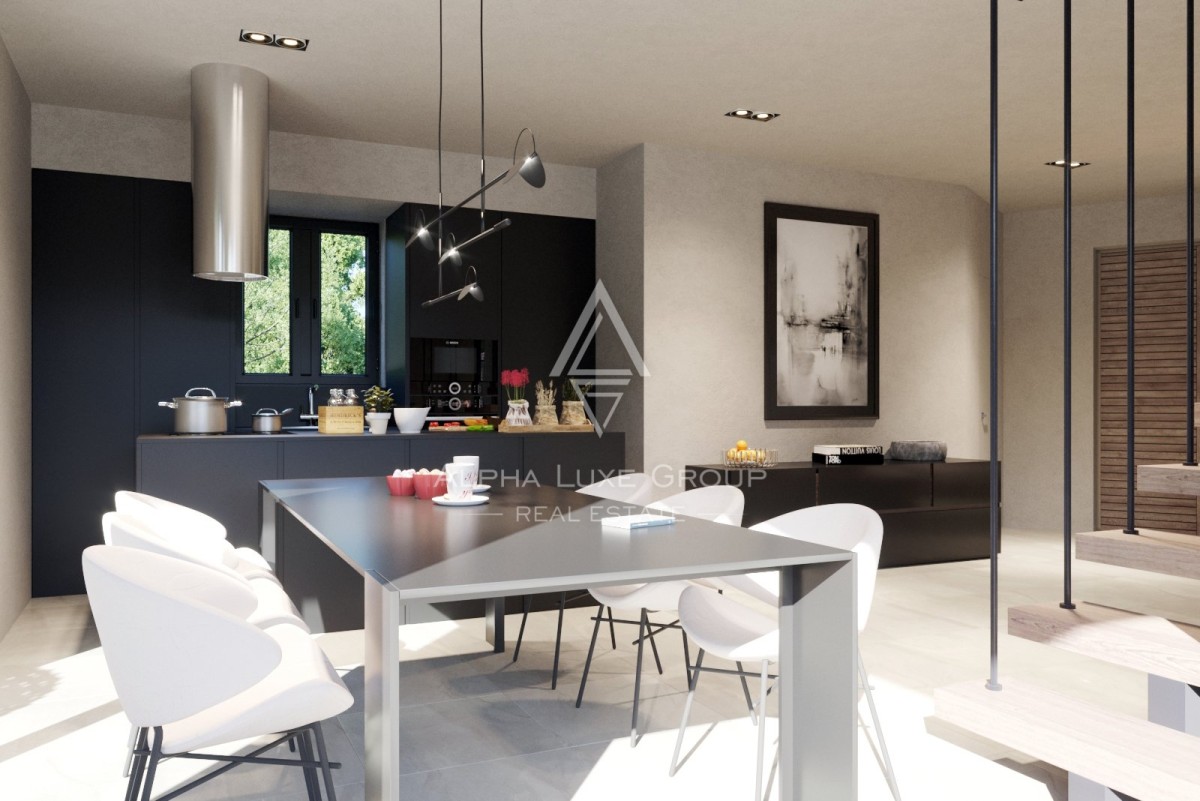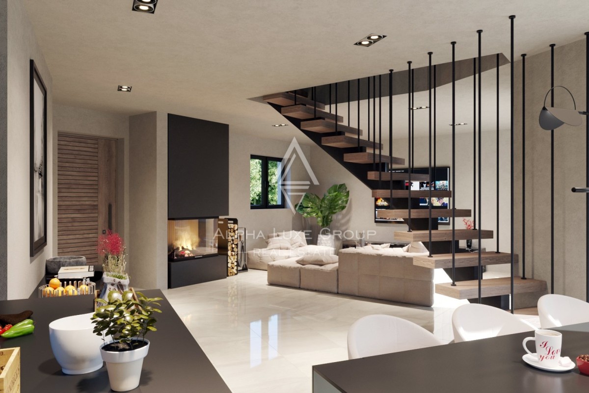 Im Erdgeschoss befindet sich ein Wohnzimmer, das durch eine Treppe von der Küche und dem Esszimmer getrennt ist und zu einer überdachten Terrasse und einem großen Swimmingpool führt. Das Erdgeschoss hat auch einen Heizungsraum, eine Toilette und ein Zimmer mit eigenem Bad. Im Obergeschoss befinden sich drei Schlafzimmer mit eigenem Bad, von denen zwei Zugang zur Terrasse haben.