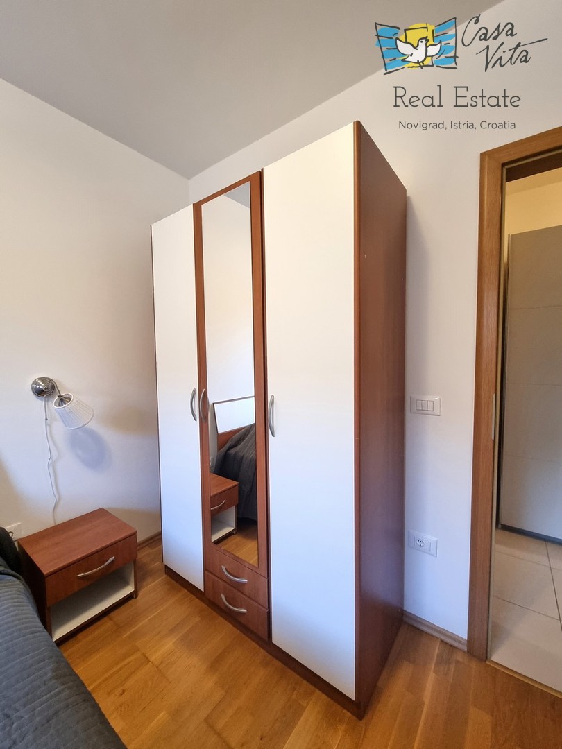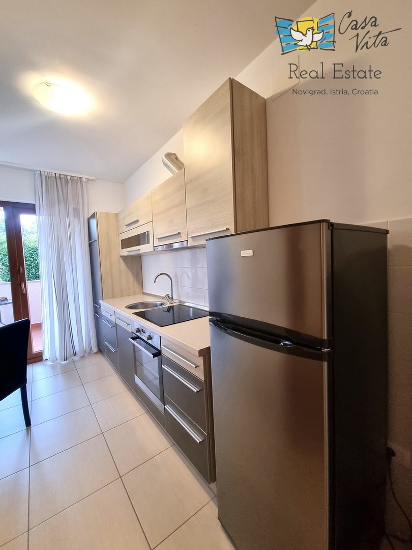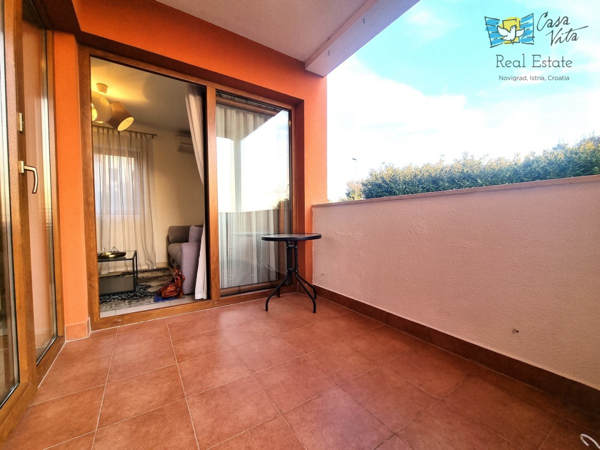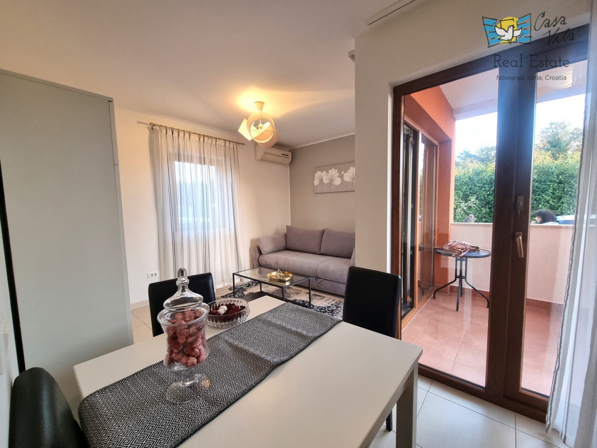 Eine kleine Wohnung zum Verkauf, eine Wohnung von 42,70 m2, befindet sich im Erdgeschoss eines Gebäudes unweit des Zentrums von Novigrad und gepflegter Strände. Das Gebäude wurde 2009 erbaut. Es ist komplett ausgestattet und dekoriert und wird als solches verkauft. Es besteht aus einer Eingangshalle, einem Badezimmer, einem Schlafzimmer, einer Küche mit Esszimmer und einem Wohnzimmer mit Zugang zur Terrasse. Von der Terrasse gelangen Sie direkt zum Parkplatz. Zur Eigentumswohnung gehört kein Garten. Zur Wohnung gehört ein Parkplatz und ein Abstellraum im Keller des Gebäudes. Die Wohnung ist ideal für 1-2 Personen, für gelegentlichen oder dauerhaften Aufenthalt.