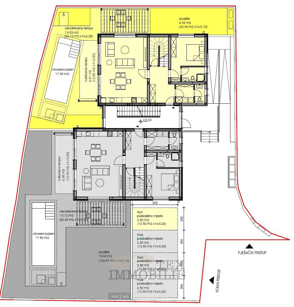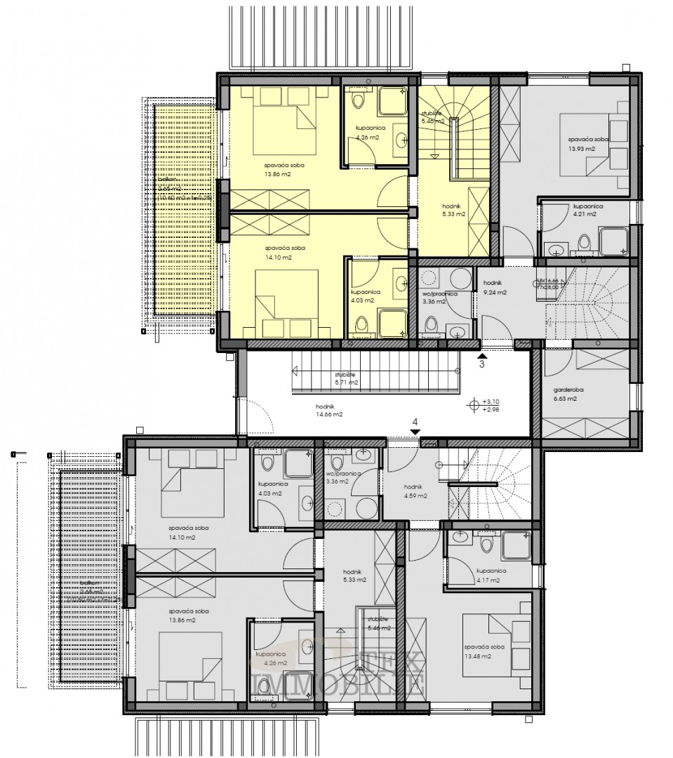 Im ersten Stock befinden sich zwei Schlafzimmer, jeweils mit eigenem Bad, sowie eine gemeinsame Terrasse. Im Untergeschoss gibt es einen Abstellraum von 7,67 m².