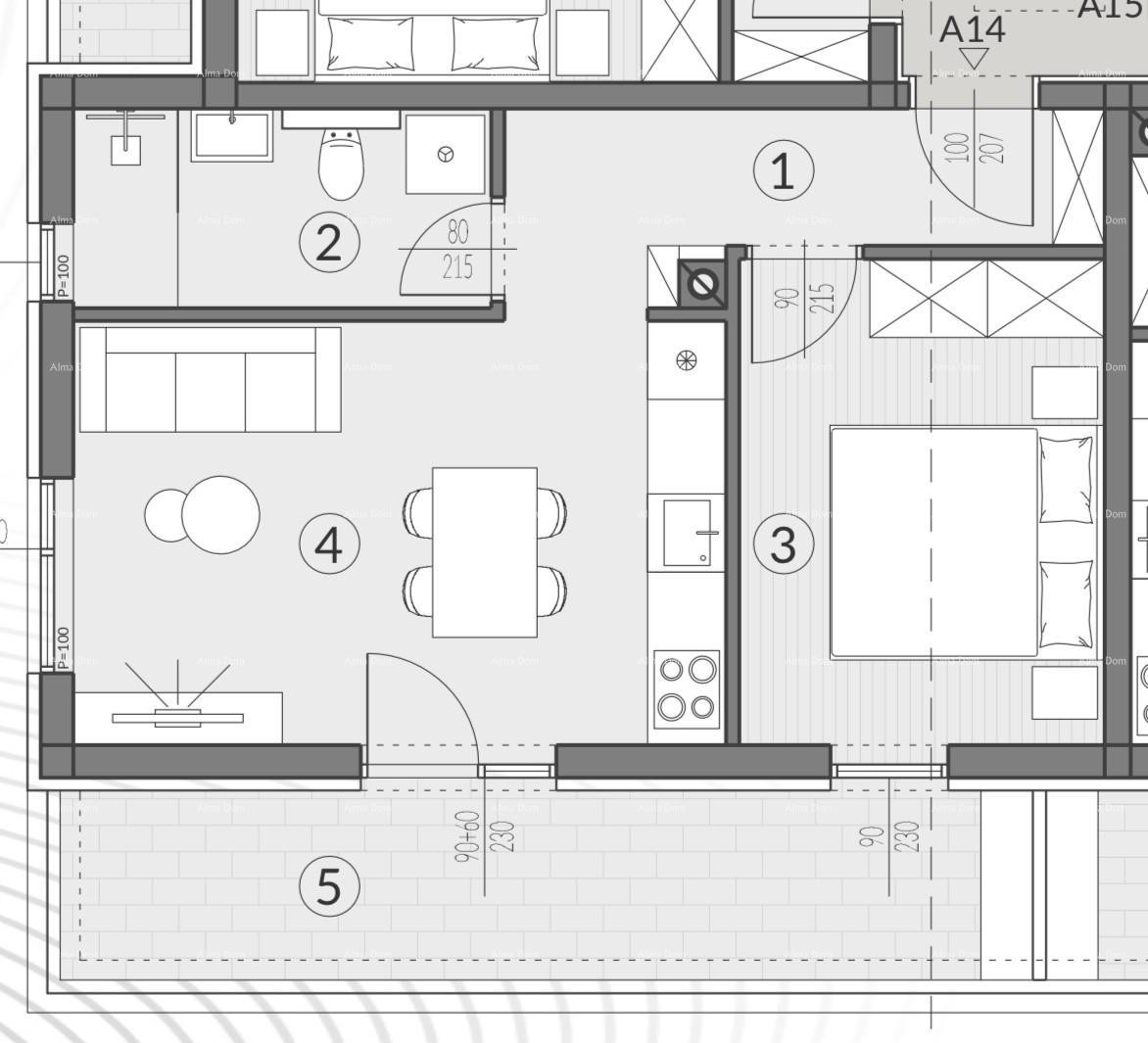 Die Wohnung A14 befindet sich im 2. Stock des Gebäudes und besteht aus: Flur+Kleiderschrank, Wohnzimmer mit Küche und Esszimmer, 1 Schlafzimmer, Badezimmer und überdachter Terrasse. Zur Wohnung gehört ein Parkplatz PM7 von 3,12 m2.