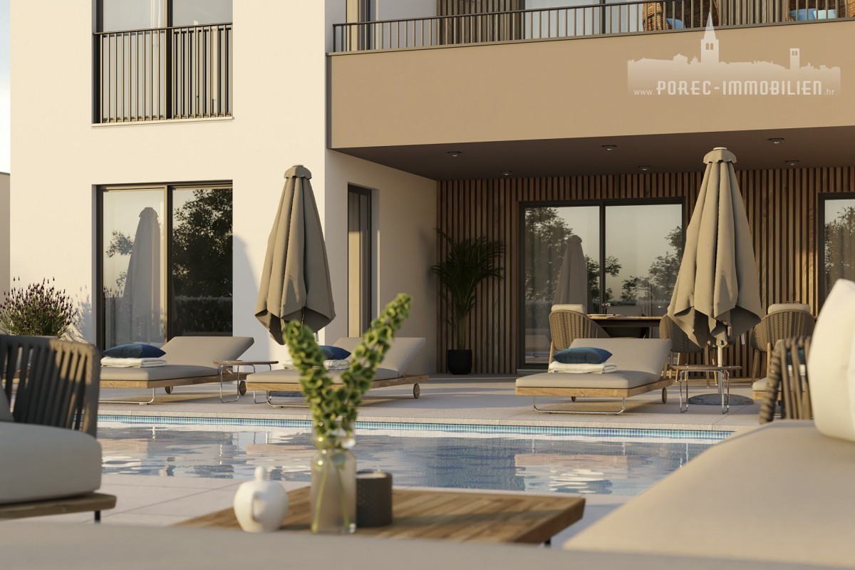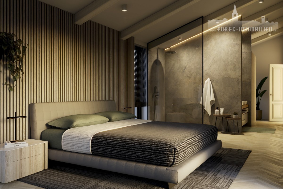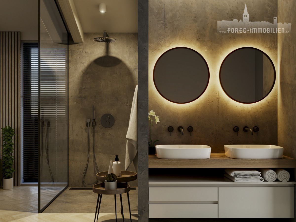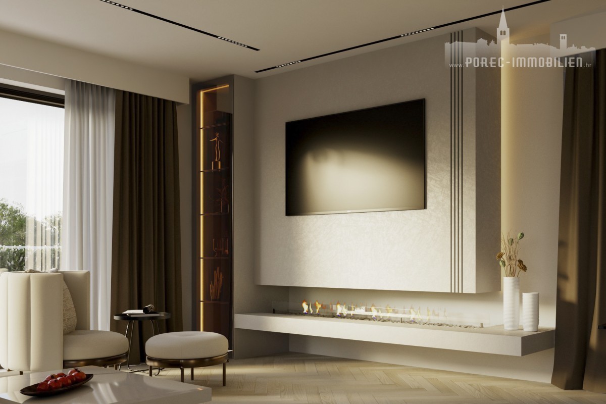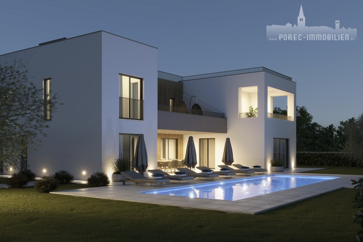 Nur 3 Kilometer von den Stränden und dem Stadtzentrum von Porec entfernt steht eine wunderschöne und exklusive Villa mit Pool und Fitnessraum zum Verkauf. Diese Villa befindet sich derzeit in der Fertigstellungsphase und zeichnet sich durch eine zeitgenössische Interpretation der traditionellen istrischen Architektur und ein modernes Innendesign aus.