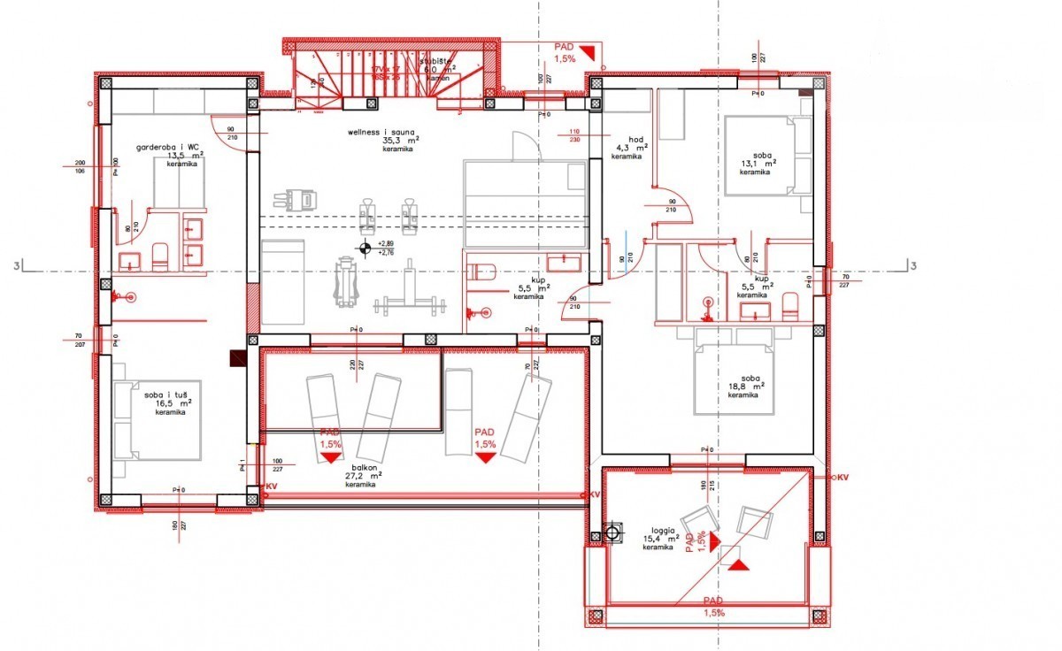 Eine interne Treppe führt in das Obergeschoss, wo ein Fitnessraum mit Sauna das zentrale Element darstellt. Auf der linken und rechten Seite befinden sich 3 Schlafzimmer, jedes mit eigenem Bad, sowie ein Balkon und eine überdachte Loggia.