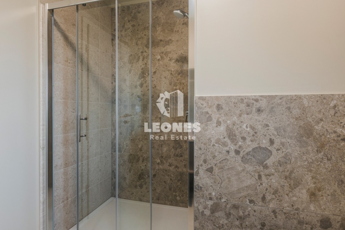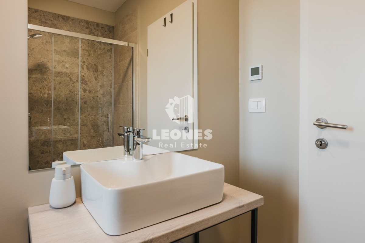 On the first floor, there is a spacious apartment of 126 m2, which consists of an entrance area, a storage room, three bedrooms, a room with exercise equipment, and a large covered terrace with a view of the pool.