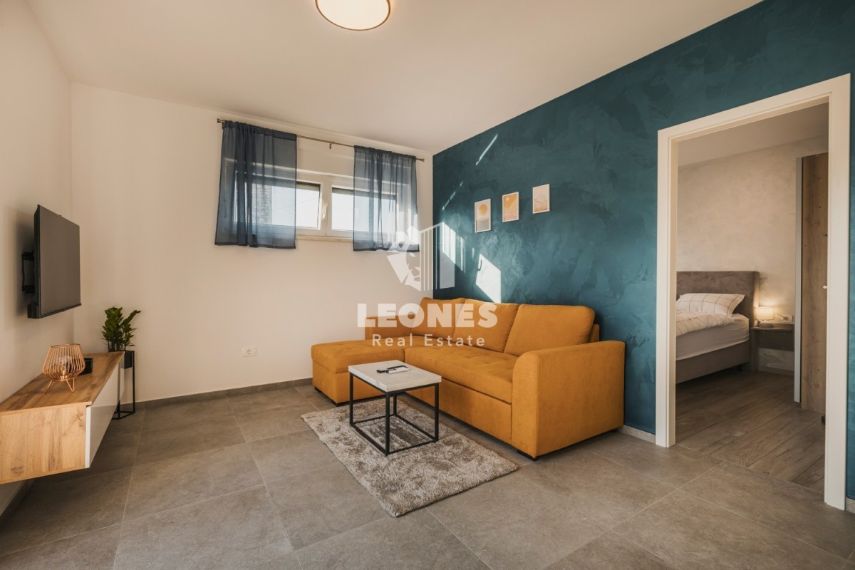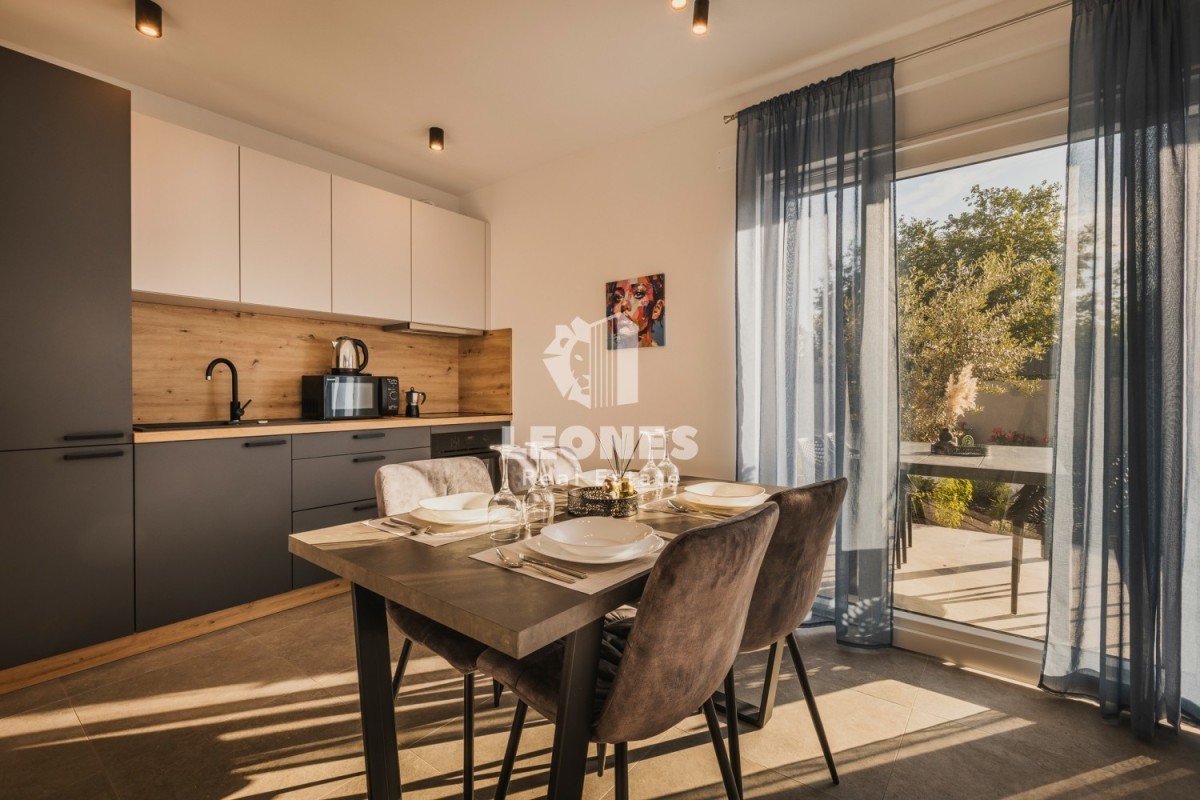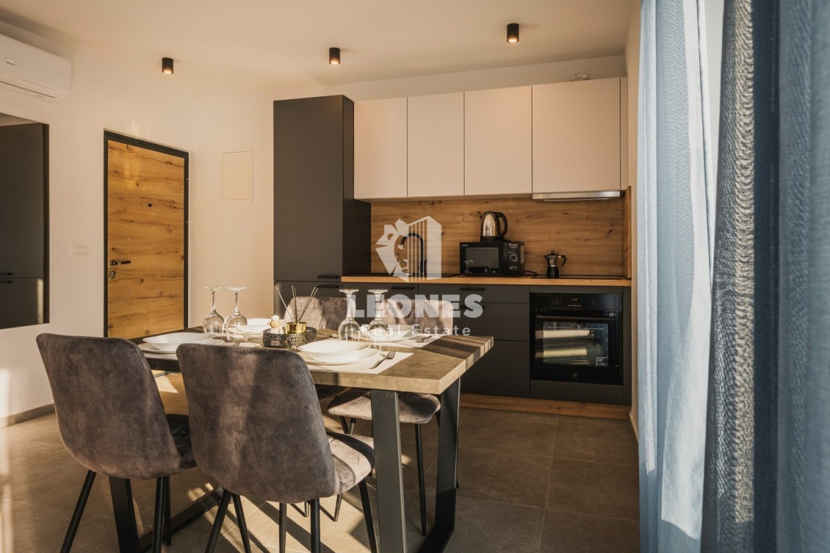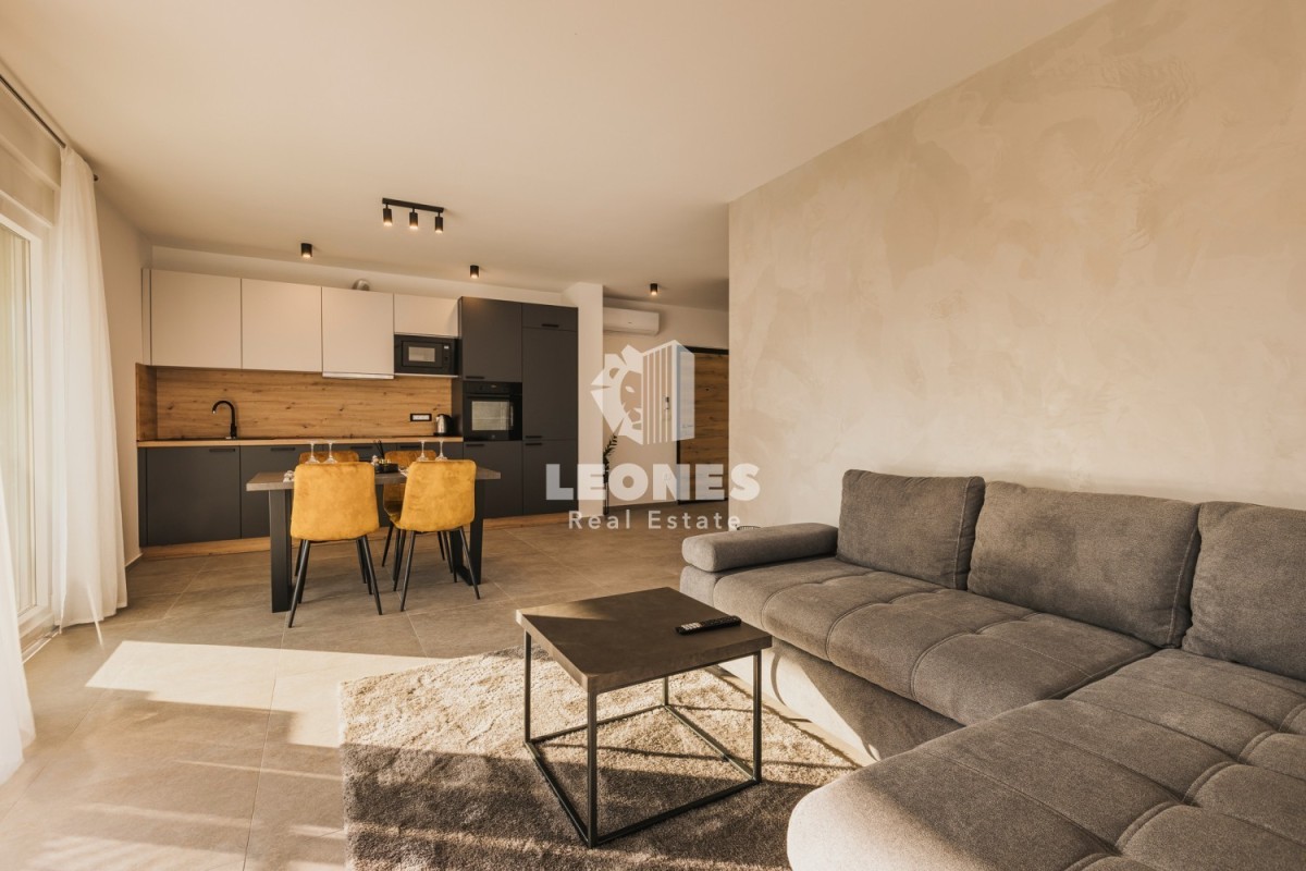 The apartments on the ground floor consist of an entrance area, an open space living room with a kitchen and dining room, a bathroom, a spacious bedroom and a terrace with a view of the pool and garden. Apartments on the ground floor have 50 m2 and 65 m2.