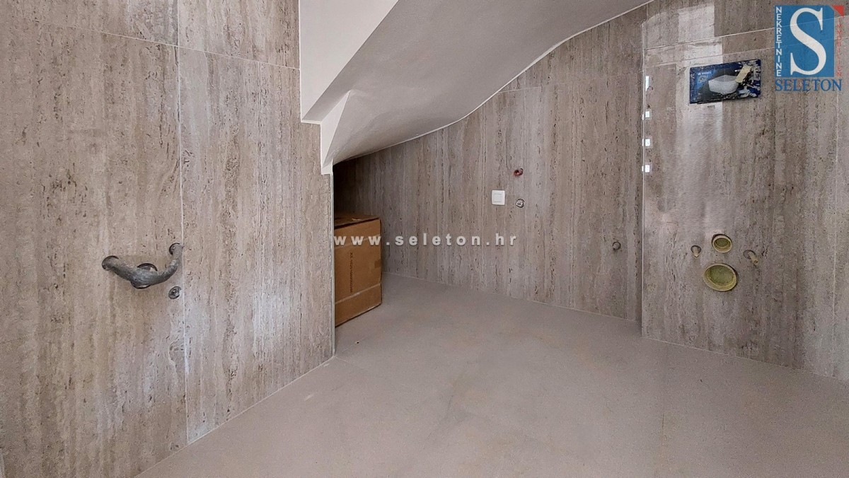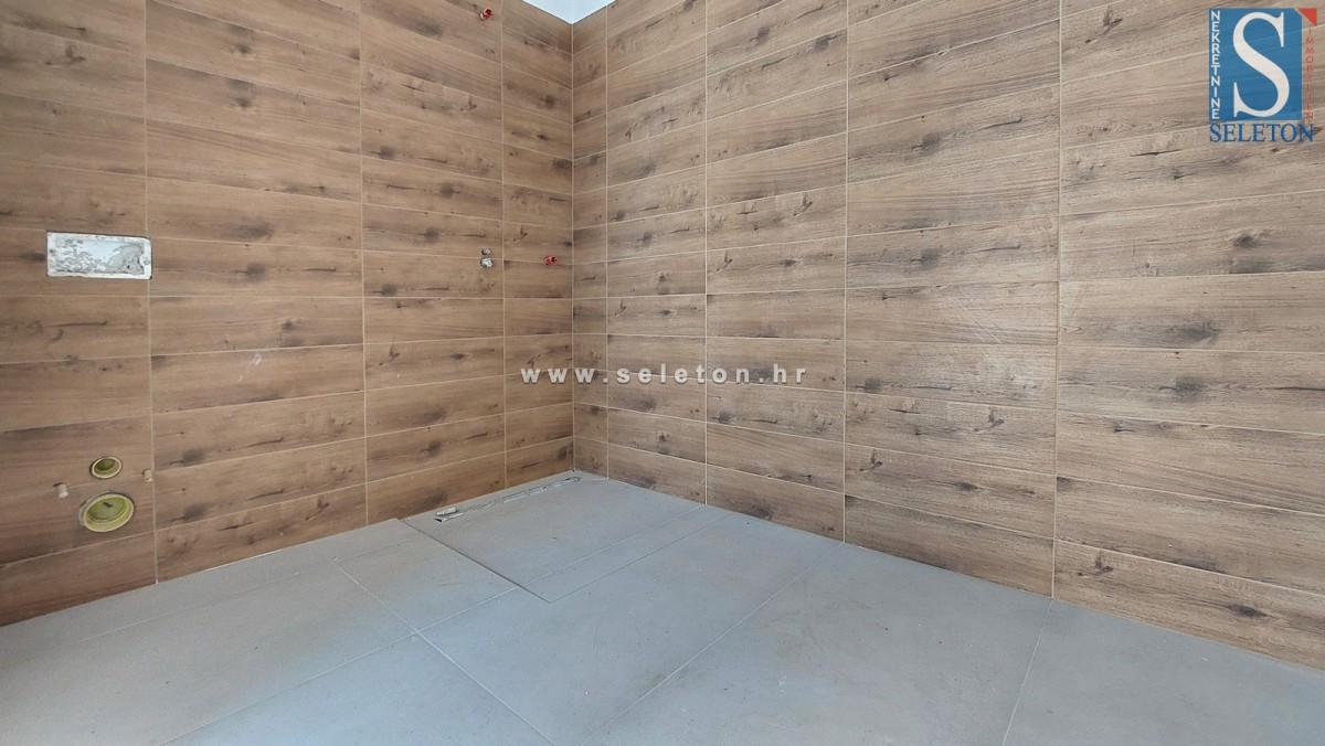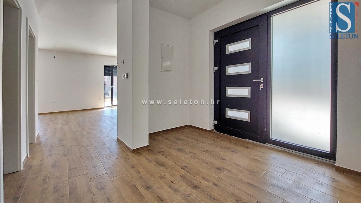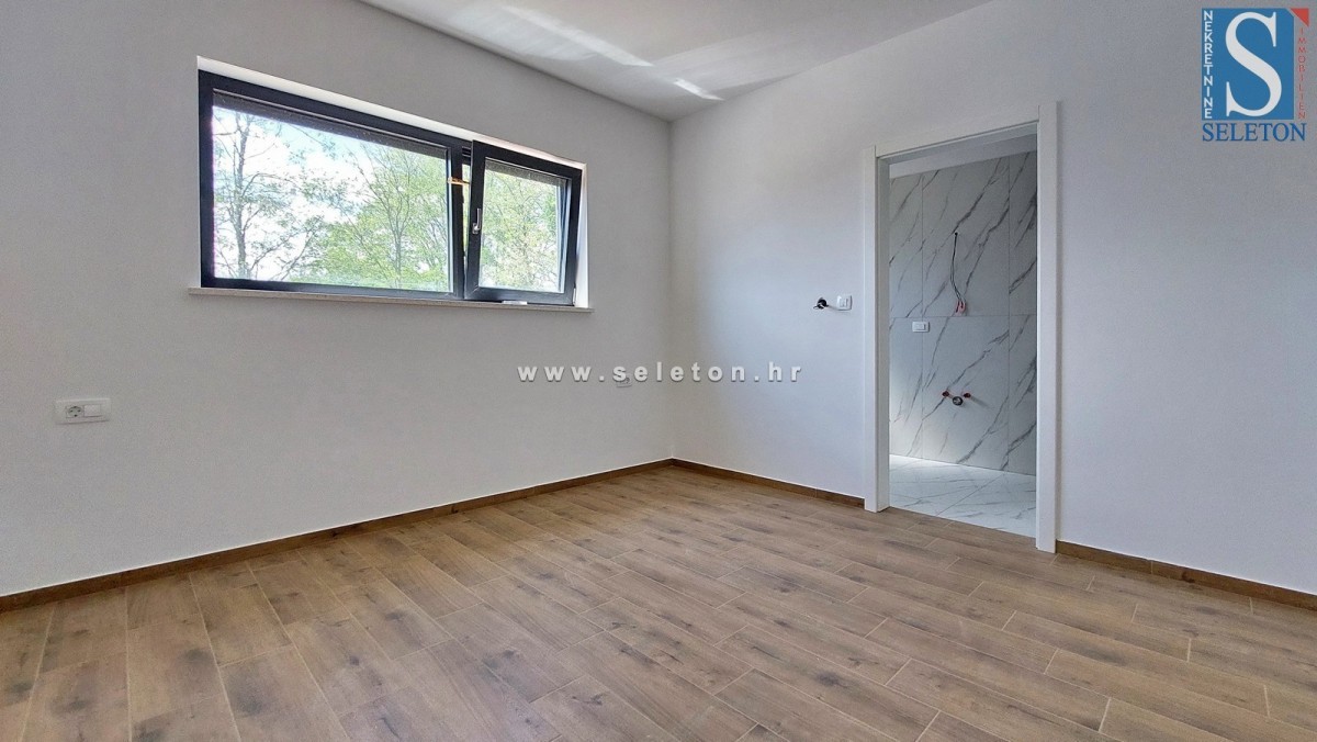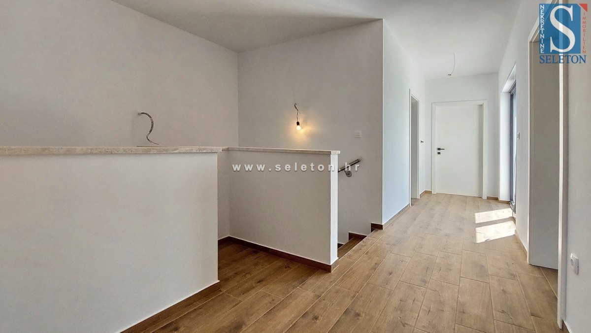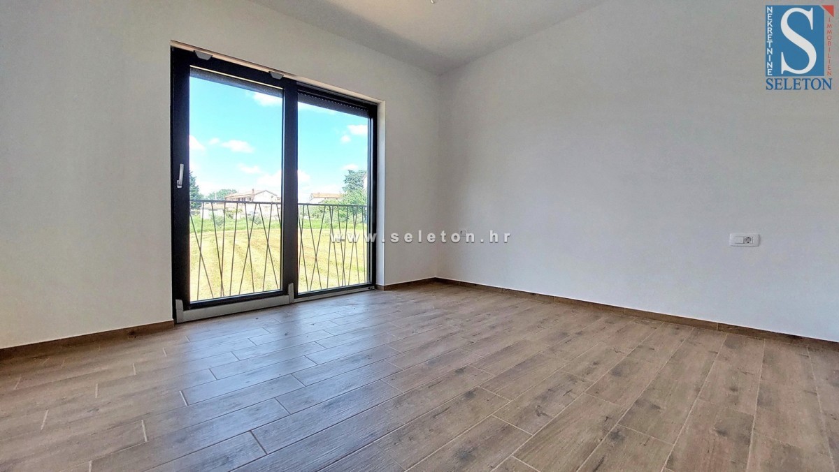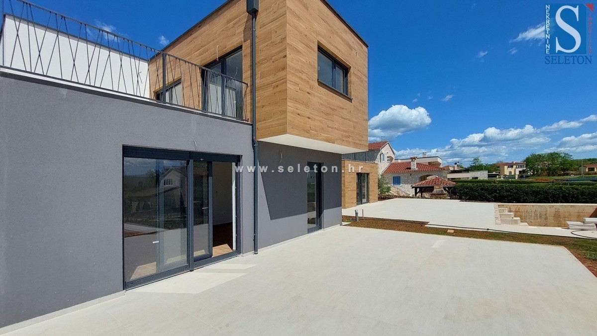 A modern semi-detached house under construction with an area of 136 m² is for sale. It consists of a living room, kitchen, dining room, terrace, bedroom, bathroom, storage room, hallway and storage room on the ground floor and a hallway, 2 bedrooms, 2 bathrooms and a terrace on the first floor of the house. The house has electric underfloor heating, air conditioning, the land has an area of 670 m², on which there are also 2 parking spaces and a swimming pool. The house is approx. 8 km from Poreč and 9 km from the sea.