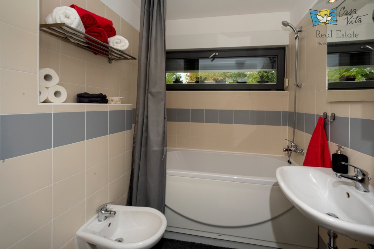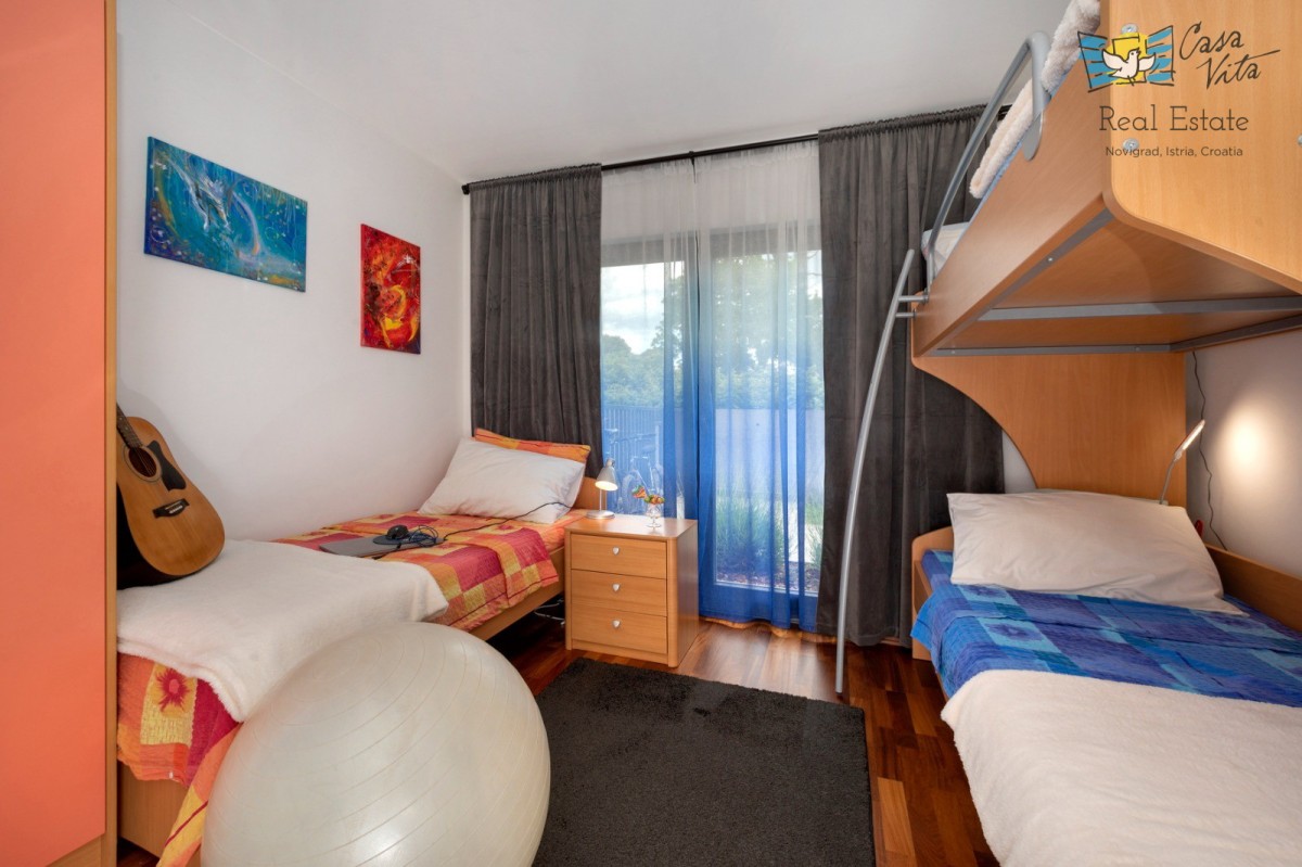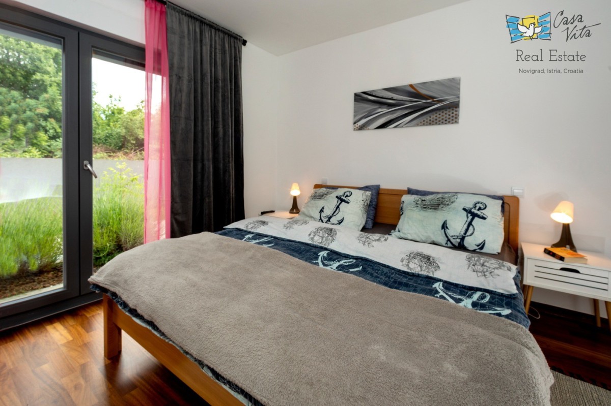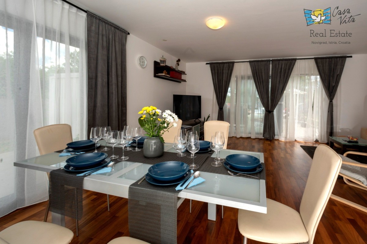A spacious apartment in Poreč measuring 98.45 m2 is located on the ground floor of a building, with a yard of 919 m2. The building was constructed in 2012. It is approximately 1300 m from the sea. The apartment has a separate entrance from other residents. It consists of an entrance hallway, two bedrooms, a bathroom, a toilet/laundry room, and a large living area (living room with fireplace, dining room, and kitchen). From the living area, there is access to the terrace, garden, and pool. In the garden, besides the terrace, there is a 40 m2 swimming pool, a garden shed, and green space. The feeling is like being in your own house. Heating/cooling is regulated via air conditioning, while the living room also has a fireplace. It represents an excellent potential for tourist rental or year-round living. The apartment also includes two parking spaces.