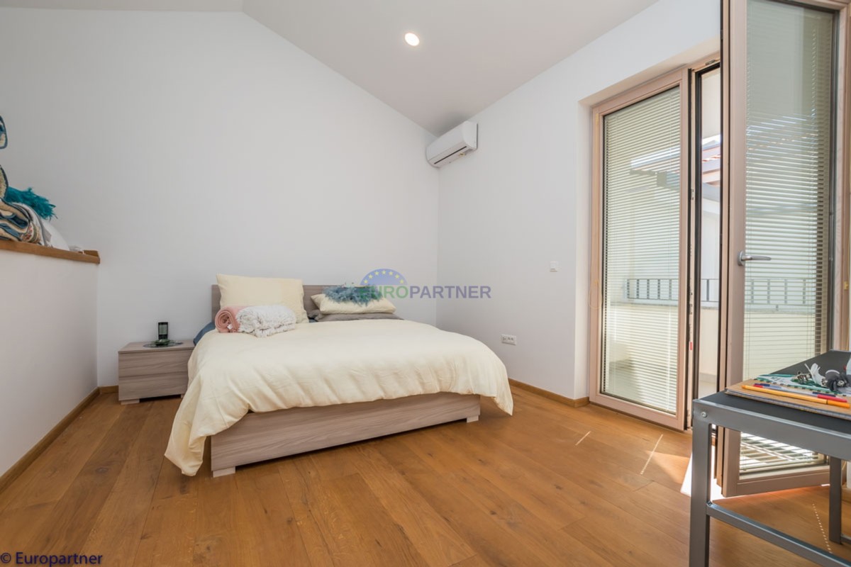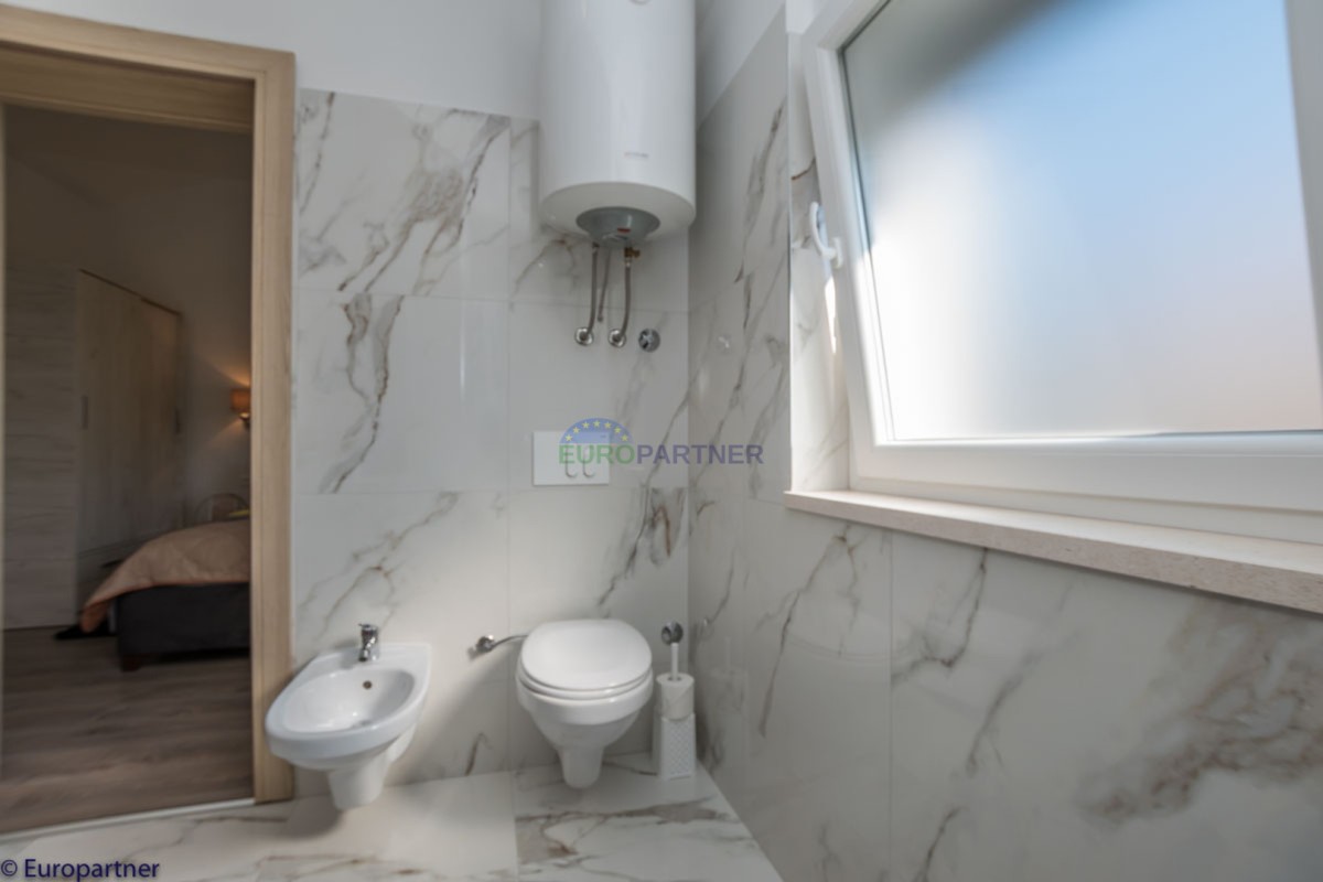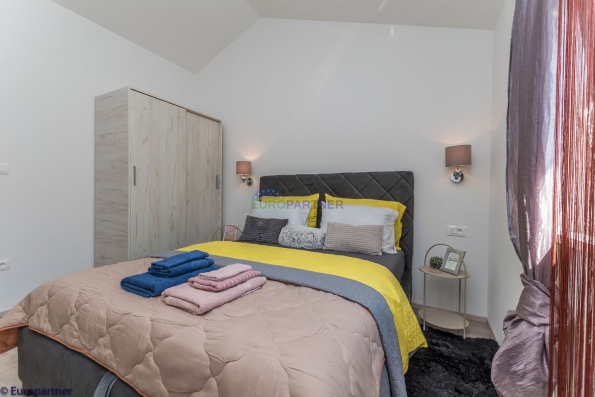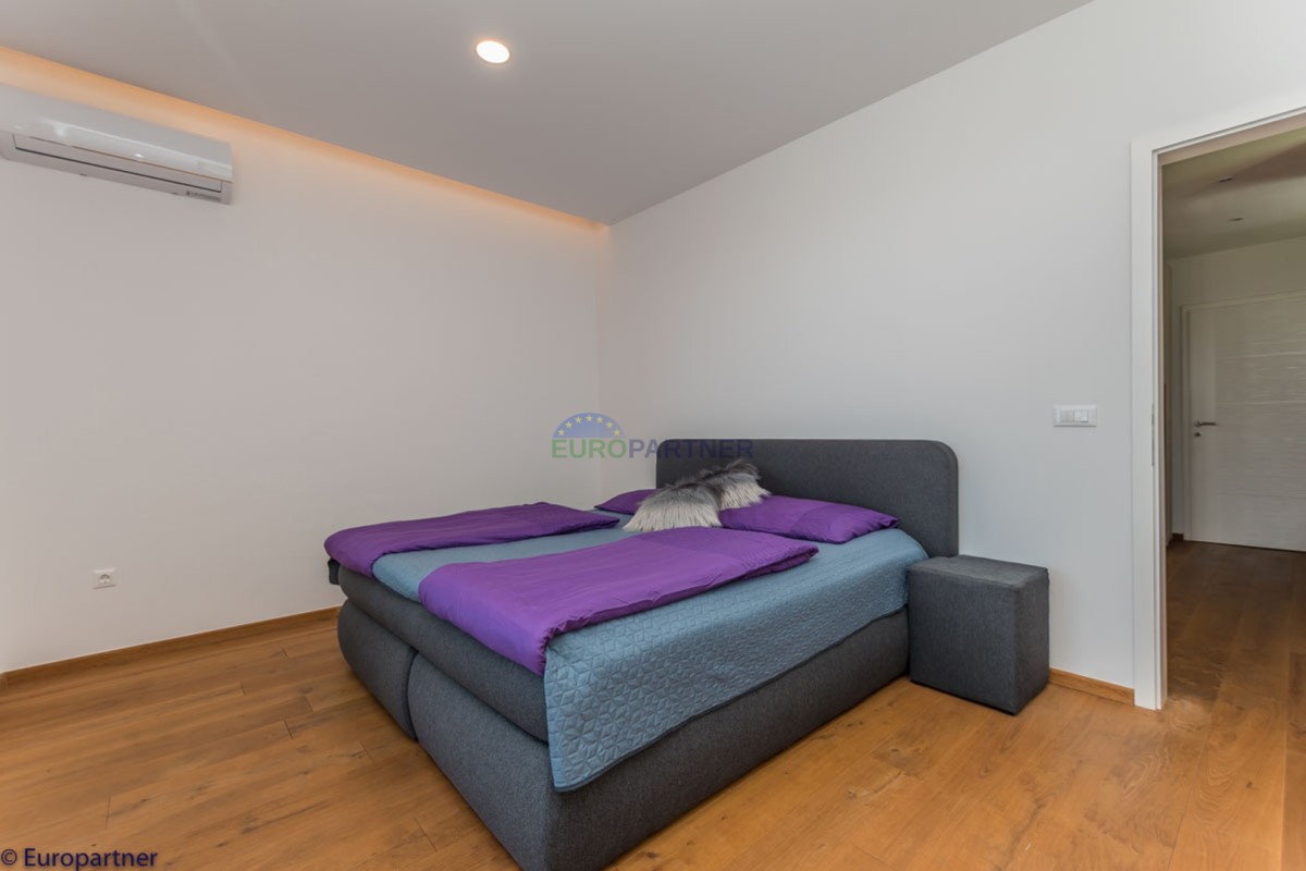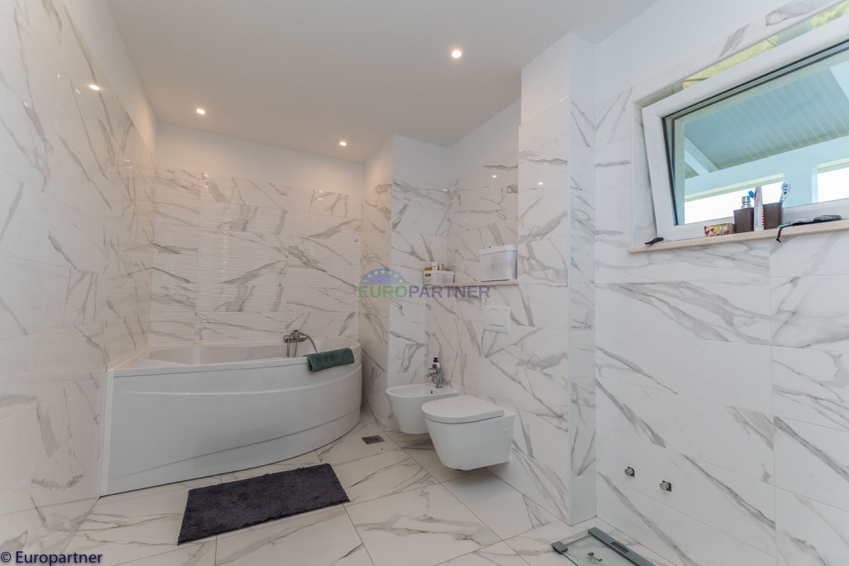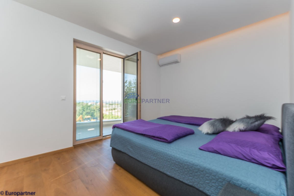This unique modern villa was designed in such a way that it consists of several residential units that offer a truly beautiful view of the sea. The villa covers 570 m2 and a 1360 m2 plot. Since technology is an integral part of our everyday life today, it has been present in our houses in recent years as well. This villa was built according to the principle of a smart house. A smart home is a home that can be managed and controlled using smartphone, tablet and computer applications. In this way, we can manage all smart home installations, which is why we call such installations smart installations. Smart installations include lighting, blinds, heating, security alarms or systems, ventilation and cooling systems. In short, a smart house provides control over all installation systems that enable a comfortable stay in our home. This villa was built as a smart house. There is a CD with stored information about wall installations. This villa is equipped with underfloor heating, air conditioners, the insulation of the villa is excellent. The house has a fireplace, an air recovery system. Jaustian carpentry, combination of wood, aluminum with four-layer glass. The villa consists of a large apartment of 365 m2 and three apartments located in the second part of the villa. The villa offers simplicity and practicality. On the lower floor there is a kitchen with a dining room, a spacious living room, a bathroom and a storage room. Upstairs there are three bedrooms and two bathrooms. The rooms have access to terraces with a view of the beautiful landscape and the sea. On the ground floor of the villa there is an apartment with two bathrooms, a bedroom, a living room with a kitchen and a dining room. The villa has a swimming pool that belongs to this unit. There are parking spaces for several cars in the yard. Apartment No. 1 The newly renovated apartment on the ground floor offers freshness and spaciousness - a bedroom with a comfortable bed, a living room with satellite channels, a kitchen with a dining room offers everything for a relaxing break from the busy life. The apartment has two terraces where you can drink your morning coffee in peace, read news, a book or enjoy the sunset - the large terrace has a beautiful view of the sea. The specificity of this apartment is that it is connected to the door of another apartment (Apartment No. 2) - yet separately separated. Apartment no. 2 The newly renovated apartment on the ground floor offers freshness and spaciousness - a bedroom with a comfortable bed, a living room with satellite channels, a kitchen with a dining room offers total comfort. The apartment has two beautiful terraces where you can fully enjoy it - the larger terrace has a beautiful view of the sea. The apartment is connected to the door of another apartment (Apartment No. 1) and gives the possibility of a single unit, yet separately it forms only one apartment. Apartment no. 3 The spacious newly furnished apartment on the first floor offers freshness and spaciousness - 2 bedrooms with comfortable beds, a living room with satellite channels, a kitchen with a dining room. The apartment has 2 bedrooms, 2 bathrooms, 2 terraces where you can truly enjoy peace - the larger terrace has a beautiful view to the sea. This villa is for sale fully furnished. The furniture is new and specially designed for every space. The white color spreads throughout the villa, which gives the impression of cleanliness and freshness. Upstairs there is a beautiful wooden floor. When decorating, every detail was taken care of, and the emphasis was on practicality and comfort. The villa offers an extremely beautiful view of the sea and nature. Due to the way it was designed, this villa is an excellent rental investment.