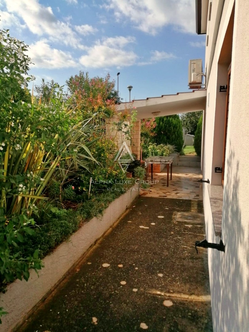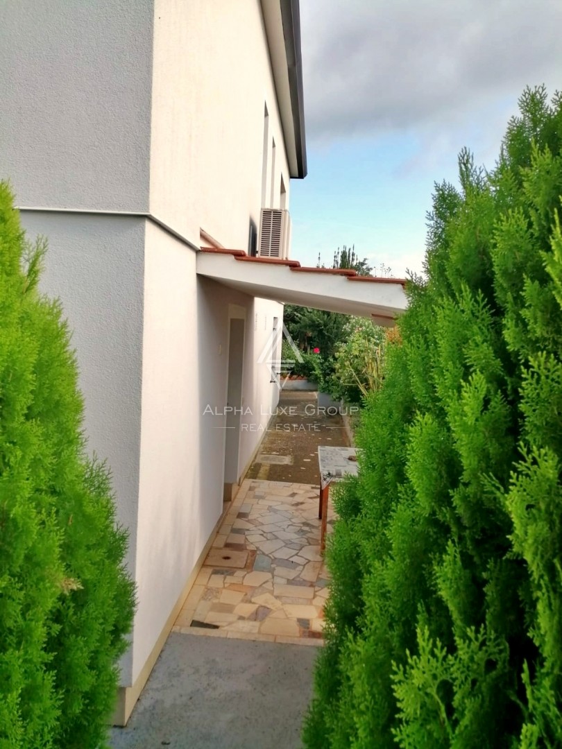Surrounded by a beautifully landscaped 1000 m² yard, the property includes parking for multiple vehicles, lush greenery, and olive trees, offering a serene outdoor space.