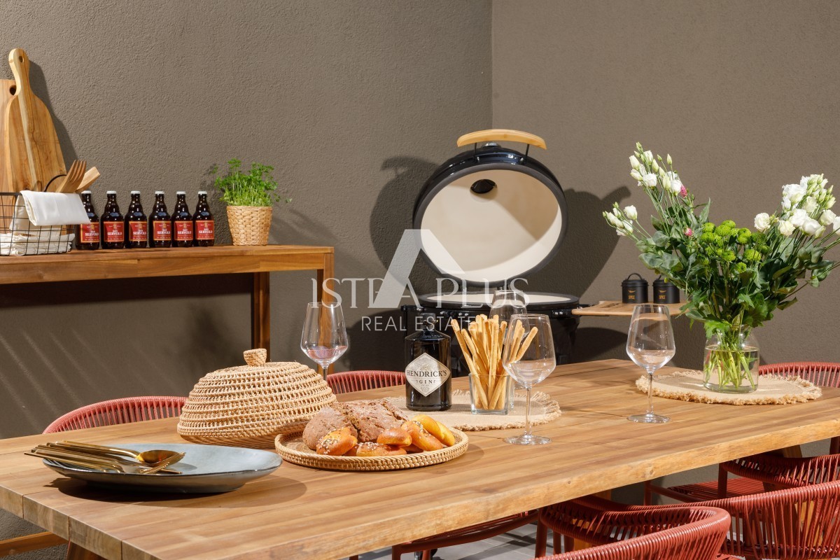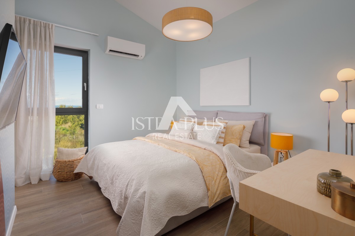 On the ground floor storage room, living room, kitchen and dining room exit to the yard and toilet. On the first floor of the house will be located two bedrooms with one bathroom, hallway. Terraced houses are an example of modern residential construction. Ten terraced houses, five on each side. They also allow a high level of privacy with a warm sense of neighborhood. Each house has a garden and parking space, and six houses have sea views. The nearest beach is 950 m away, and the center of Porec 2 km. Each house consists of two floors and has an average of 65 square meters, with more or less square footage, depending on the location of the house. The size of the garden varies from 42 m 2 to 104 m 2, and the space is fenced. The interior is organized in such a way that the unique space of the kitchen, dining room and living room on the ground floor, with access to the terrace, while the upper floor rooms. The larger bathroom is upstairs and the toilet is on the ground floor. Each house has one parking space with the possibility of adding more parking spaces. Special attention is paid to the organization and arrangement of the interior to make the stay in the house as pleasant as possible. The emphasis is on natural light, which is abundant thanks to the large glass surfaces. The modern style of decoration with daylight and the use of natural colors contribute to the ambience radiating optimism and comfort. The ground floor is a fluid room with an extension of the garden, and is designed as a central place for daily activities. Upstairs are the bedrooms, and the vertically separated gallery space of one of the rooms will be a favorite creative haven - for both adults and children. Proven combination of comfort, safety and functionality makes these houses the living spaces of the future. The location of the property achieves an ideal balance between a quiet environment and proximity to all desired facilities such as city center and beaches. outstanding quality of life.