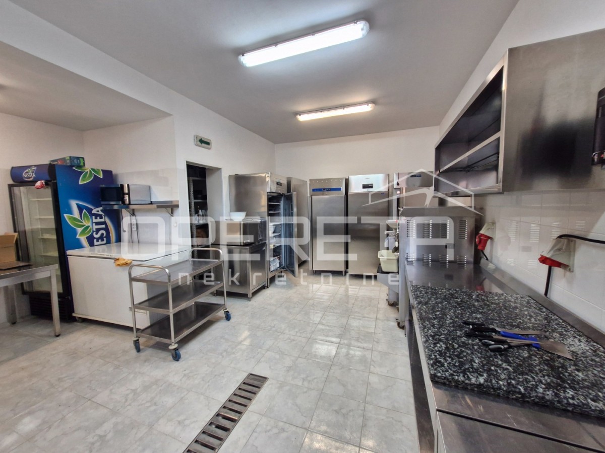 The ground floor is arranged as a business space, ideal for a pastry shop or cafe, with complete equipment including a kitchen, wardrobe and serving area. An additional benefit is a permit to use the terrace during the summer months, which makes it very attractive for catering businesses.