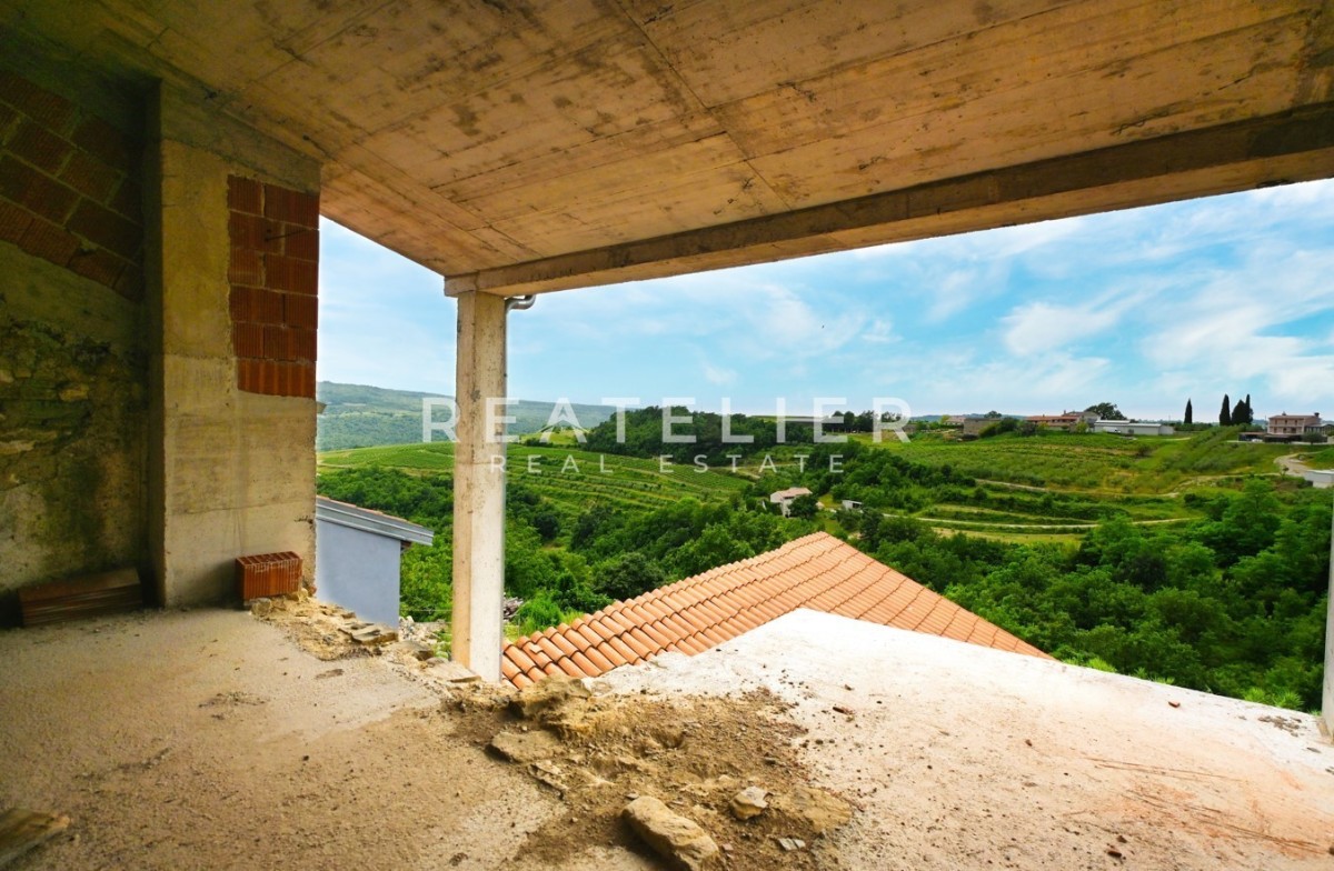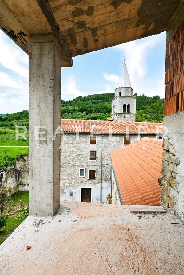 The house has a footprint of 58 m2 over a total of 4 floors in the center of Kostanjica with a direct view of Grožnjan, Motovun, and the surrounding vineyards and olive groves. The roof of the property has been renovated, and the adaptation of certain parts of the interior has begun (staircase, reinforced concrete slabs, and part of the partition walls).