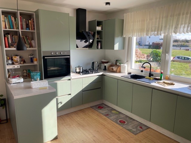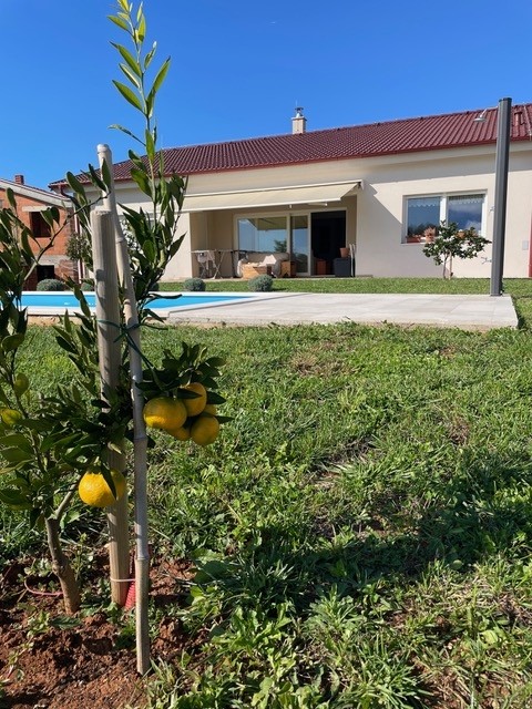 The property includes two parking areas with a total of four parking spaces (one equipped with an electric vehicle charger). On the spacious plot there are 15 mature fruit trees (mandarin, orange, cherry, sour cherry, pear, peach, quince, fig, and jujube), as well as several productive grapevines. Next to the designer wood-fired barbecue, there is an outdoor sink and an attractive rough concrete work surface. The vegetable garden is enclosed with gabions (stones in wire cages).