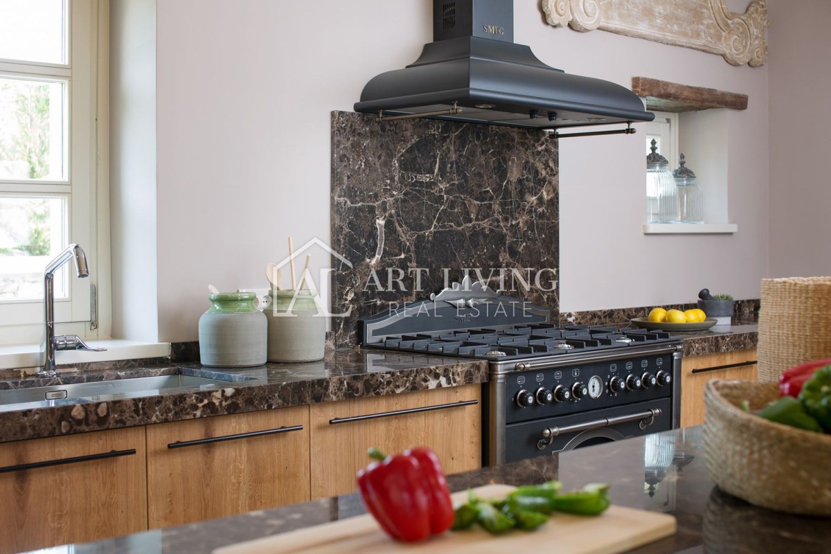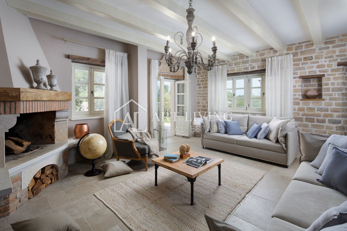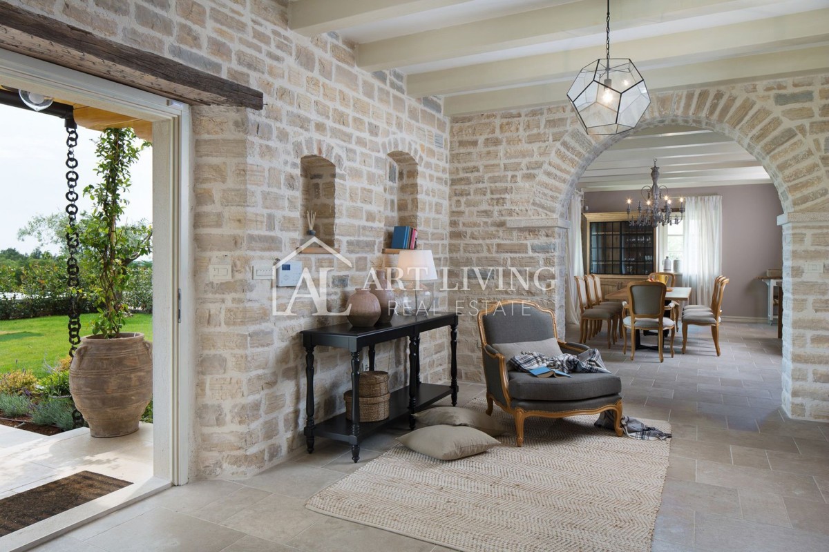 Luxurious luxury stone villa in Istrian style with a swimming pool of 297 m2 in central Istria, 23 km from Porec and 26 km from the picturesque Rovinj. The villa is elegantly furnished and furnished with designer furniture. The villa has a high level of comfort and from the balcony on the first floor there is a beautiful panoramic view of the sea.