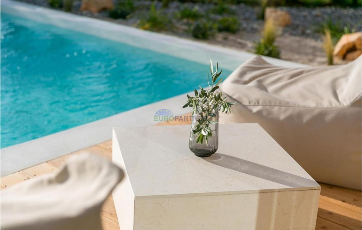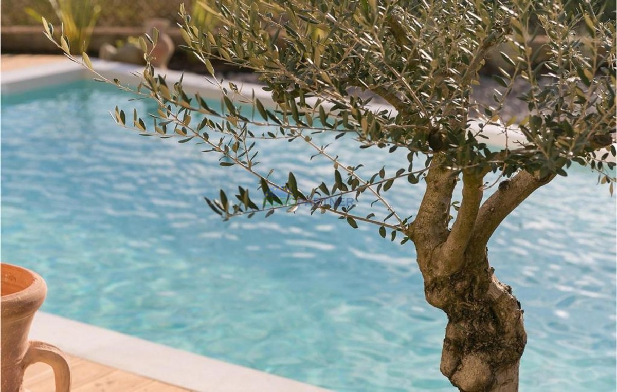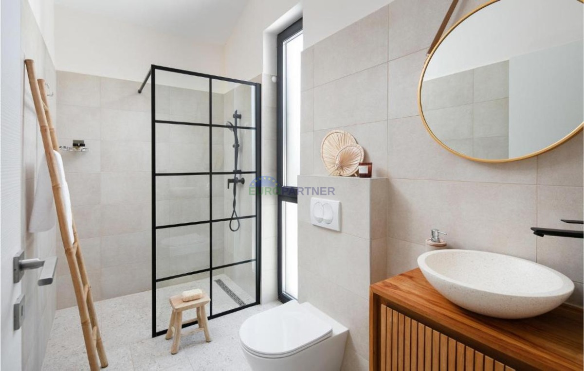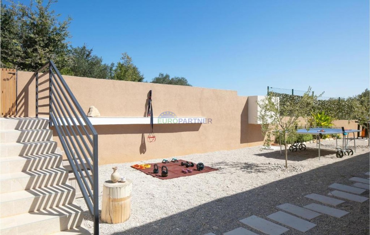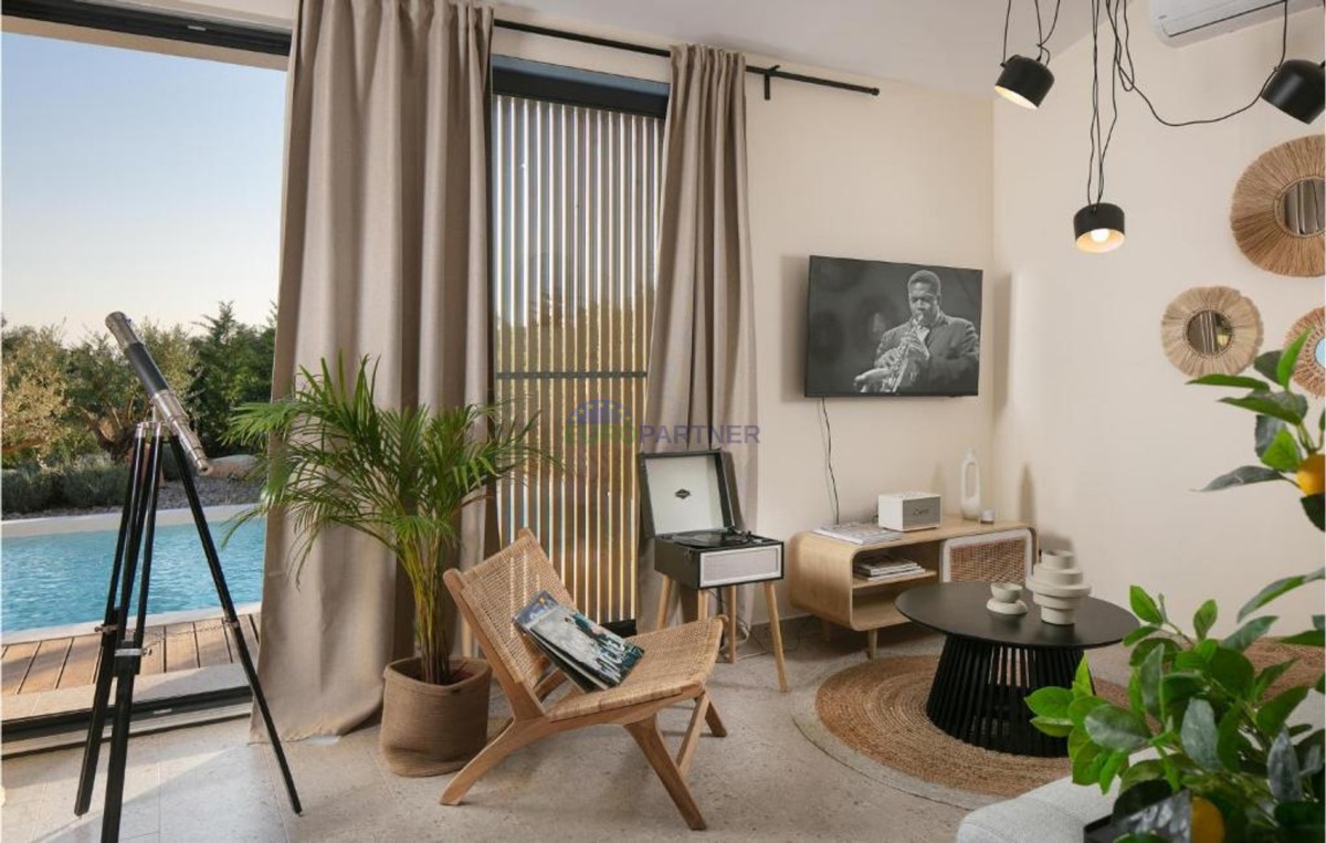 Step out onto a peaceful private terrace with a comfortable seating area, perfect for relaxing mornings or sunset gatherings. The highlight of the outdoor space is the beautiful 47 m2 swimming pool, surrounded by an elegant wooden deck. The garden is artfully landscaped with decorative pebbles, olive trees and charming amphorae, creating a Mediterranean oasis.
