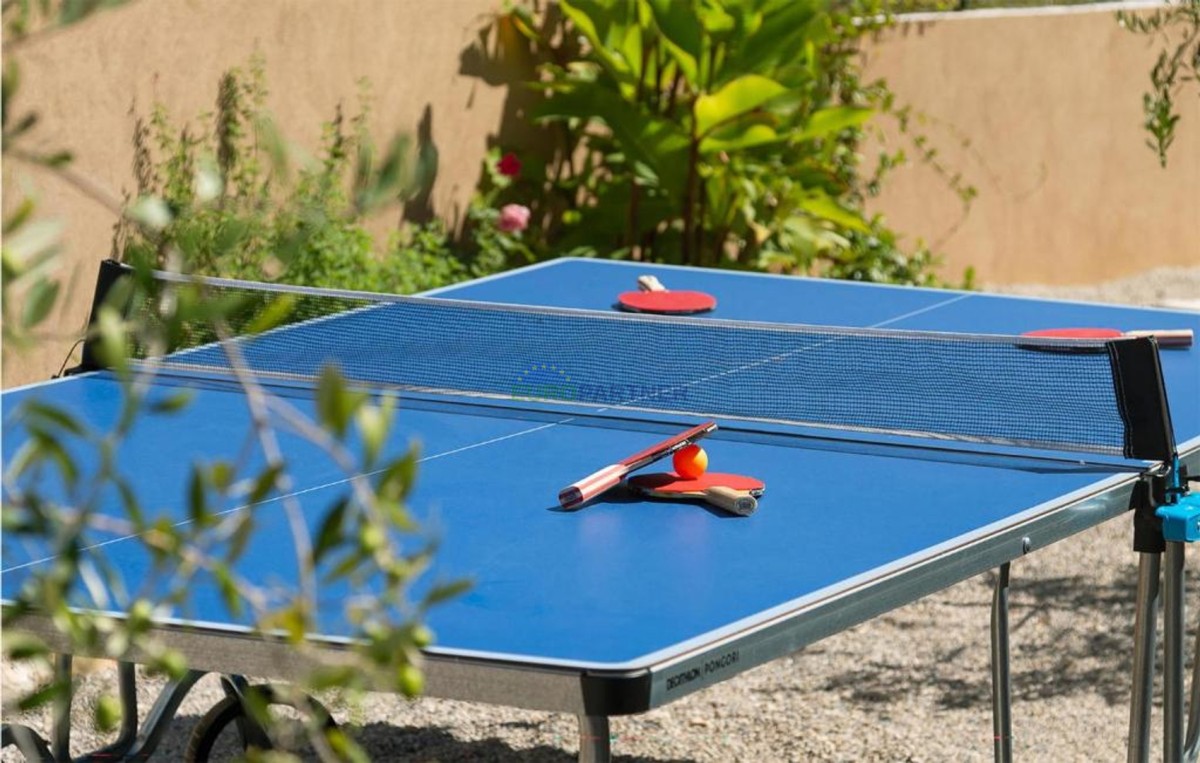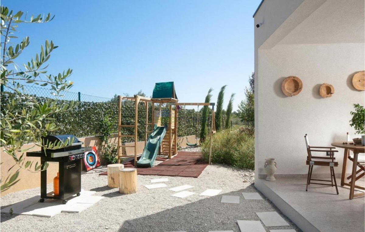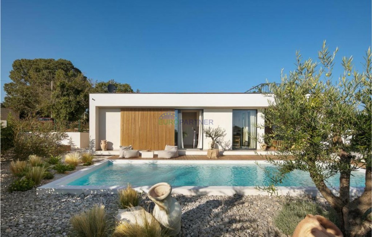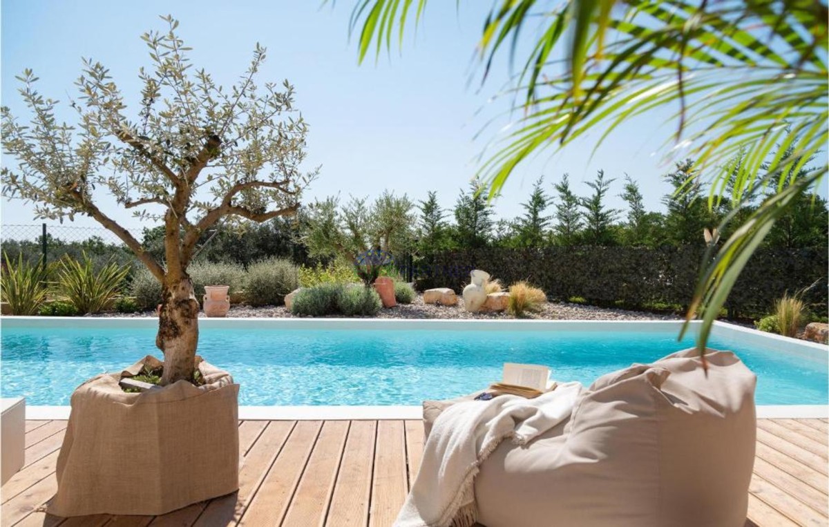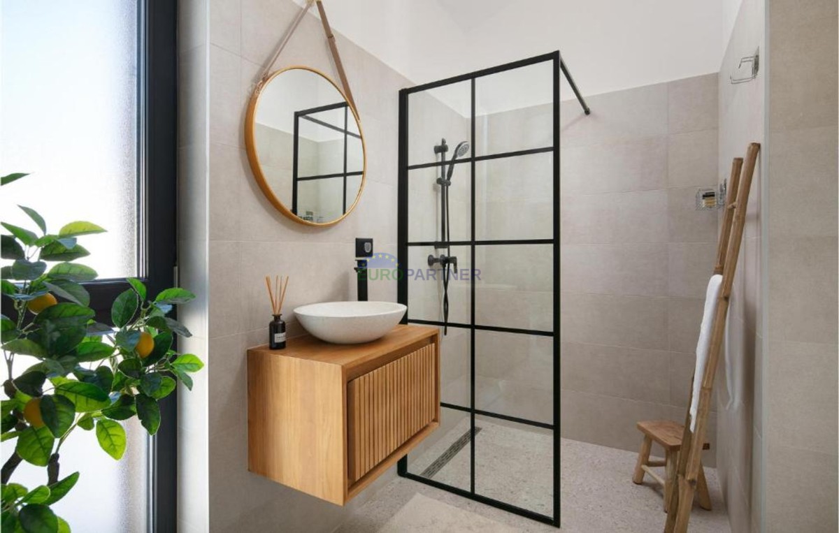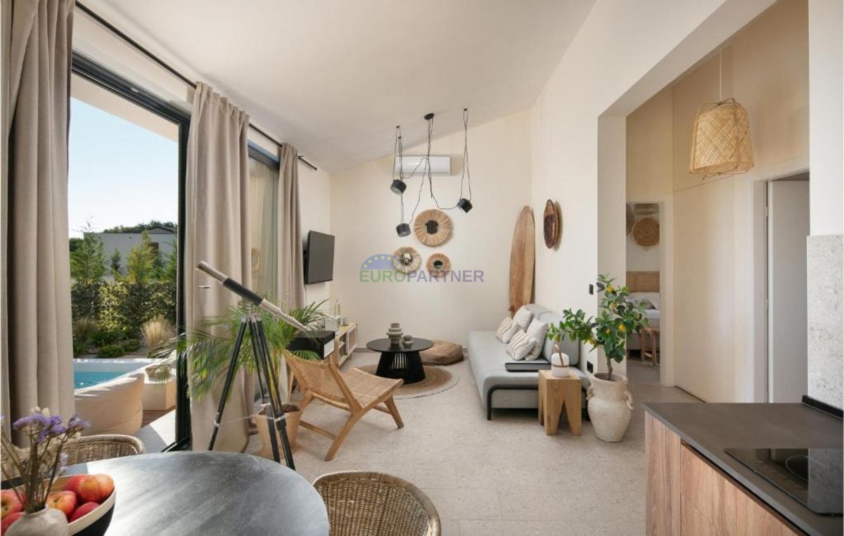 Step out onto a peaceful private terrace with a comfortable seating area, perfect for relaxing mornings or sunset gatherings. The highlight of the outdoor space is the beautiful 47 m2 swimming pool, surrounded by an elegant wooden deck. The garden is artfully landscaped with decorative pebbles, olive trees and charming amphorae, creating a Mediterranean oasis.