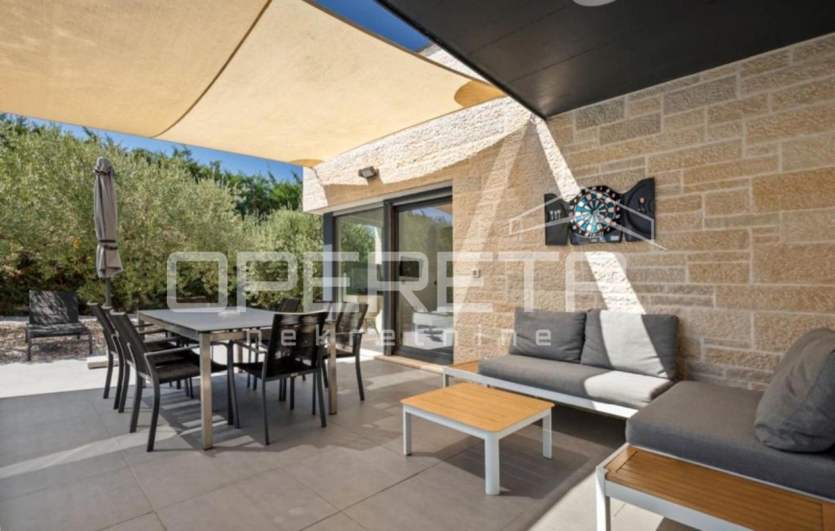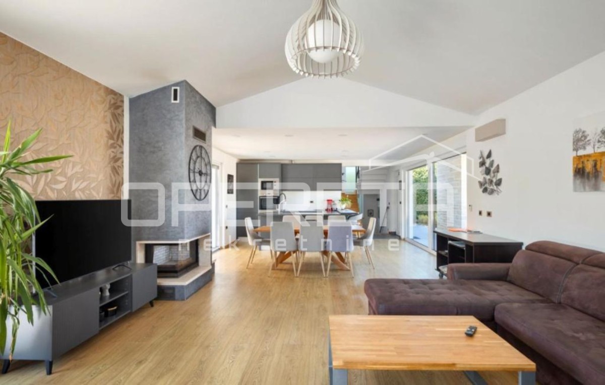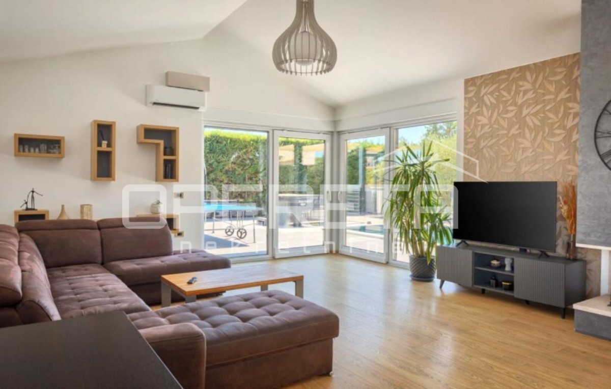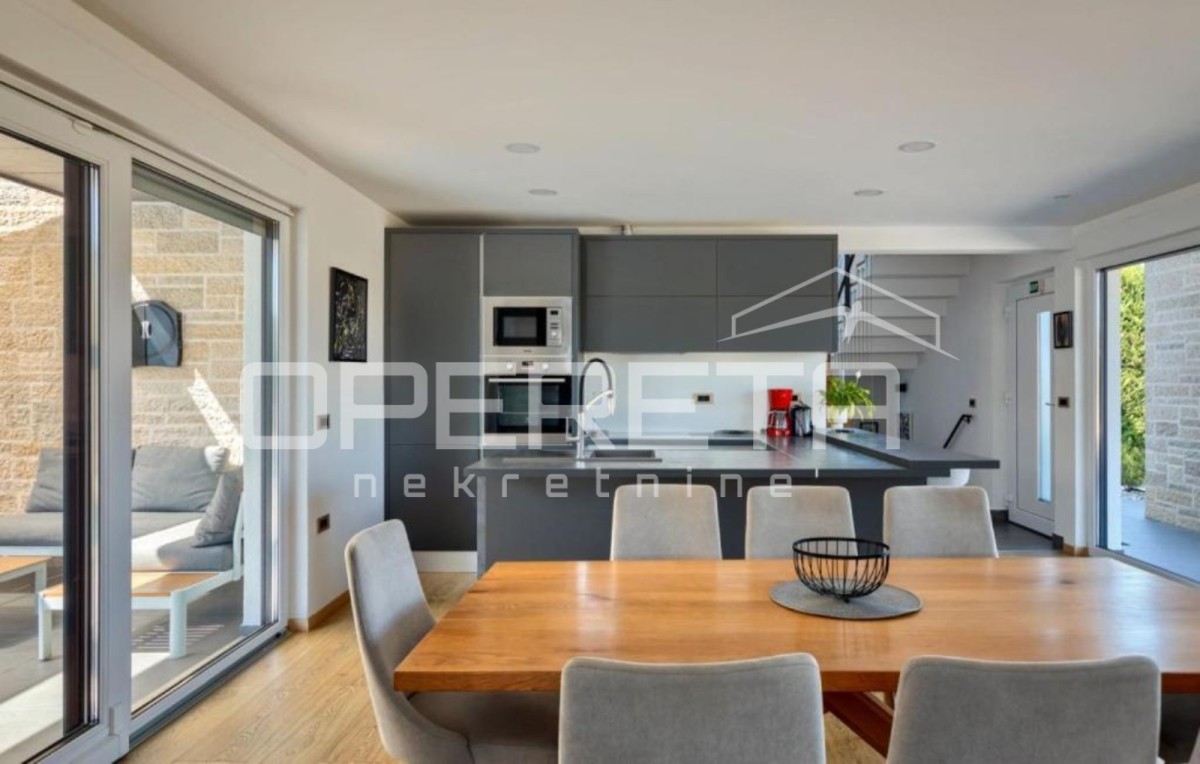 This house of modern architecture, spanning 250 m², is located in a quiet settlement in the vicinity of Poreč and extends through three floors.