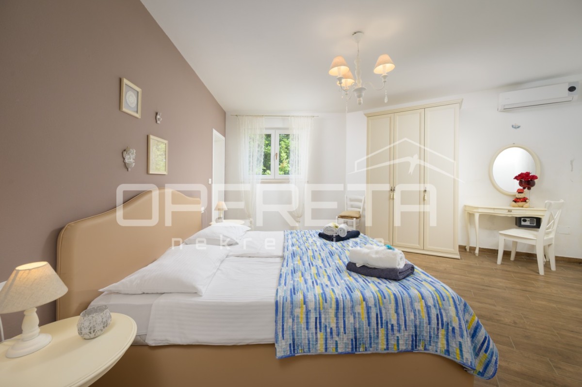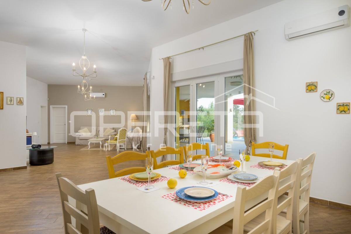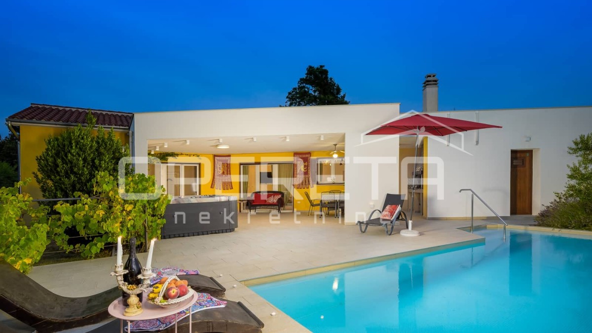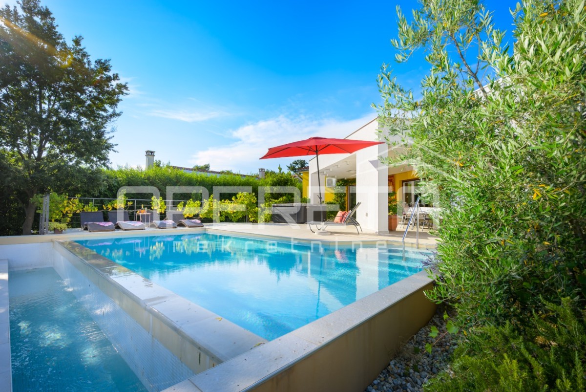 The house is fully air-conditioned and equipped with a sauna. The living area opens onto a covered terrace with a fireplace, while below there is a swimming pool with a sunbathing area, ideal for enjoying warm Istrian days.