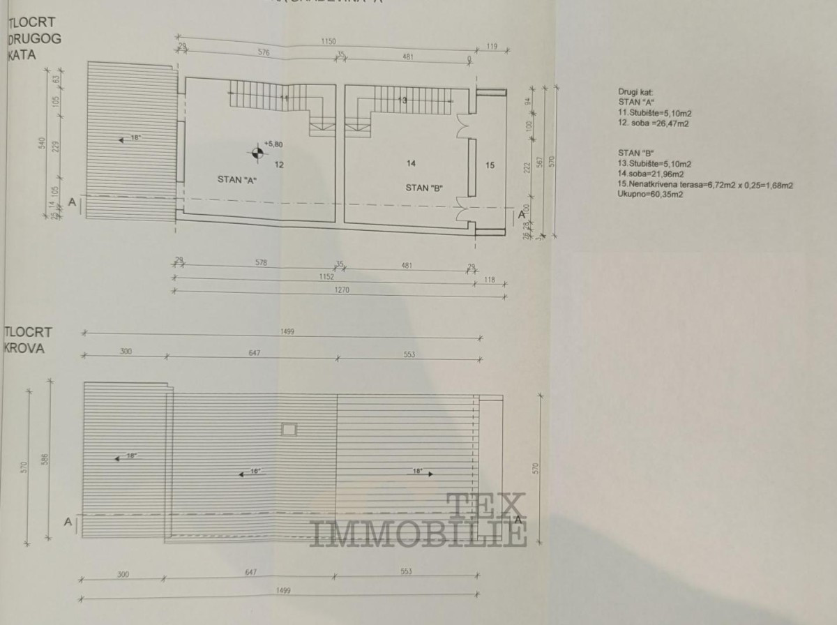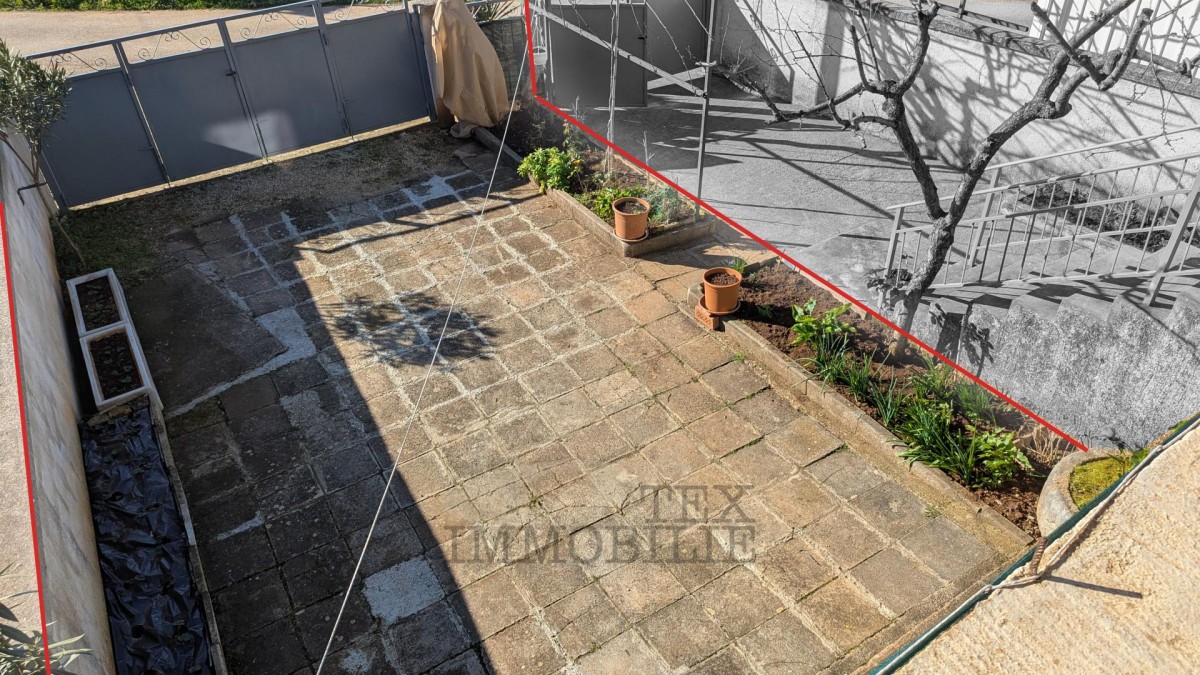 The first residential unit has an area of 110 m² and consists of three rooms spread over three floors, a covered terrace and a yard of approximately 60 m².