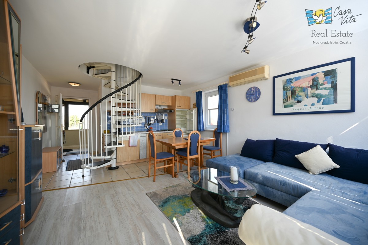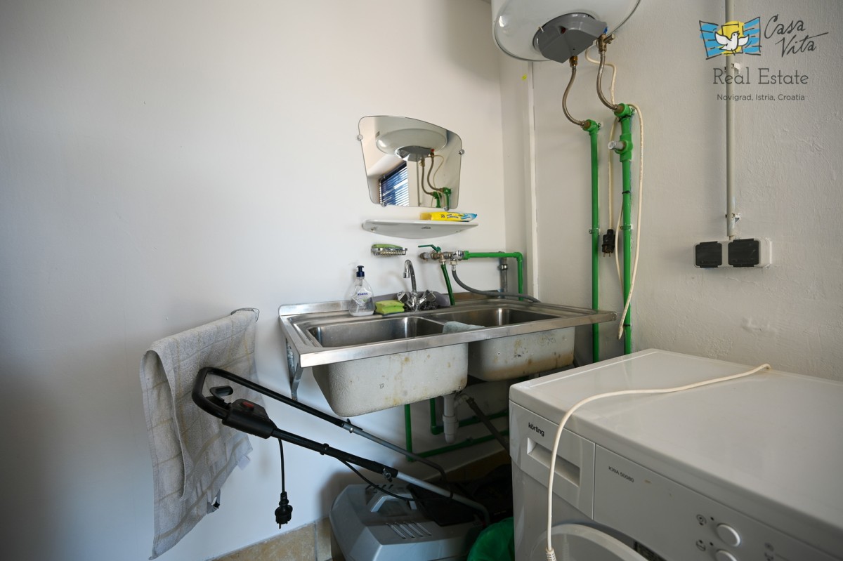 A spacious end terraced house is for sale, consisting of a 28m2 studio apartment and an 18m2 garage, both on the ground floor, as well as a two-bedroom apartment of 55.80m2 on the first floor and attic, located in a quiet part of Novigrad. This property represents an excellent opportunity for family living or as an investment due to its functionality and location.