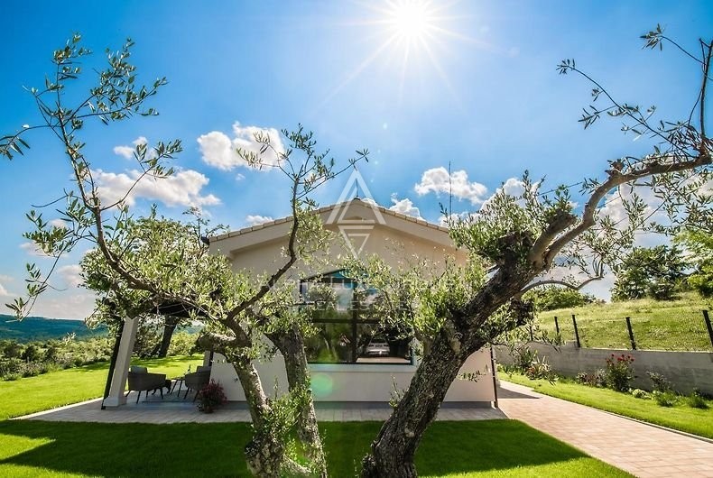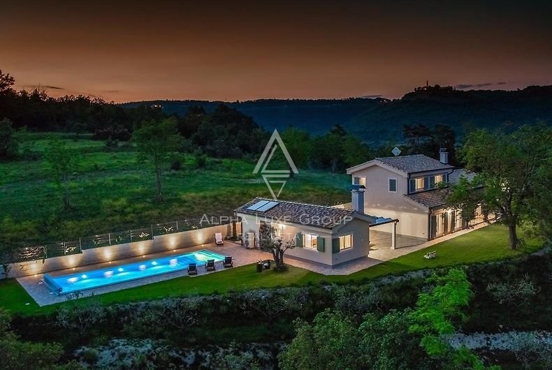 Nestled in the serene hills of Grožnjan, surrounded by lush vineyards and olive groves, this luxurious stone villa offers the perfect blend of elegance, comfort, and tranquility. Located in a private and secluded setting, far from neighboring properties, the villa boasts top-quality craftsmanship and attention to detail, featuring natural materials and sophisticated design.