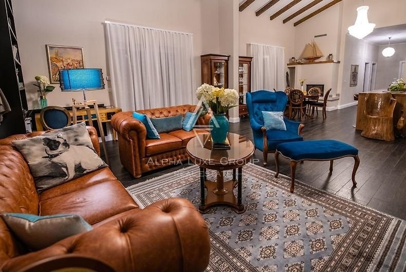 The main villa features a spacious living room, a modern kitchen with a dining area, three bedrooms, a walk-in wardrobe, a study, two bathrooms, a separate toilet, and a terrace. The guest house offers a cozy fireplace, a kitchen, a bedroom, and a bathroom, making it ideal for visitors or rental opportunities.