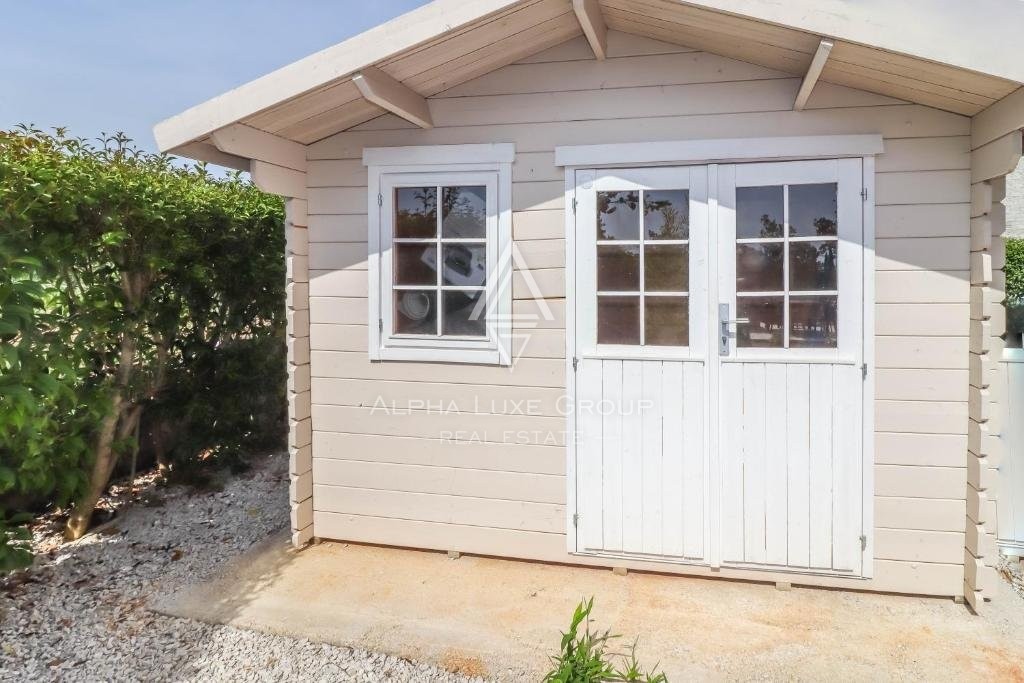 Outdoor features include a summer kitchen with a charming fireplace, a covered terrace for blissful outdoor moments, and covered parking for two vehicles, ensuring convenience and security. A separate storage building at the rear is perfect for keeping poolside and garden equipment.