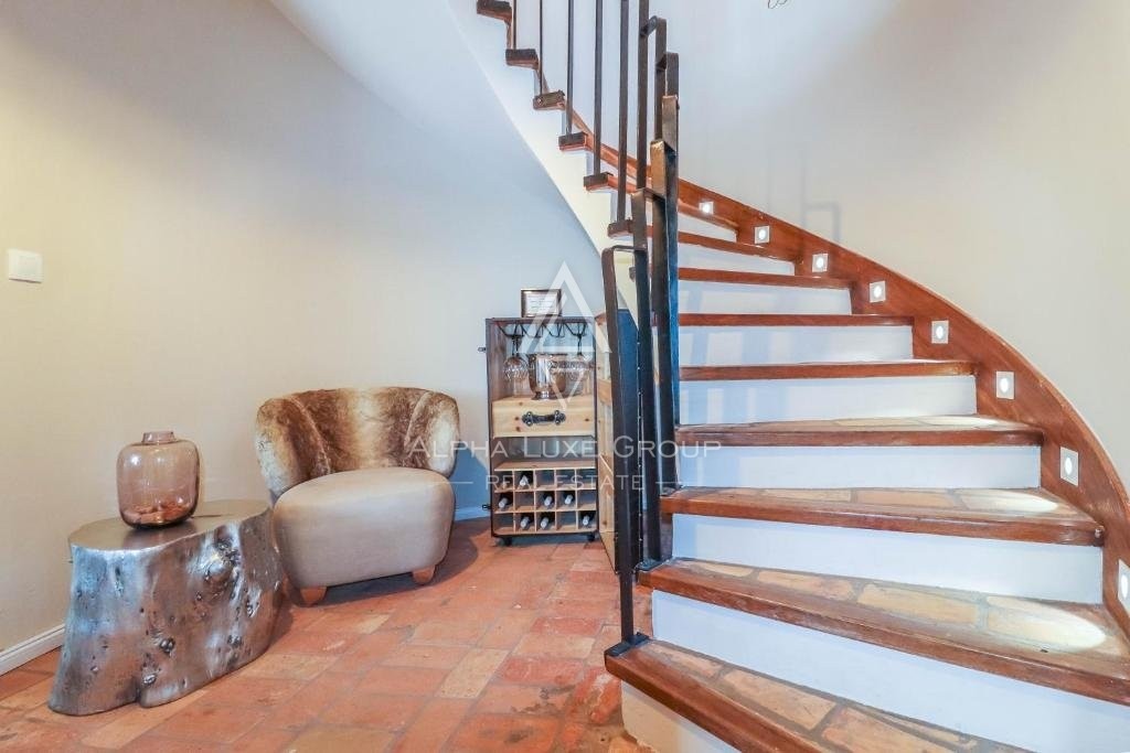 Ascending the elegant staircase, the first floor reveals a spacious corridor, bathroom, and three tastefully furnished bedrooms, one with an ensuite. Each room, fitted with quality furniture, satellite TV, and air conditioning, promises comfort and privacy. One bedroom offers balcony access, presenting panoramic views of the enchanting surroundings.