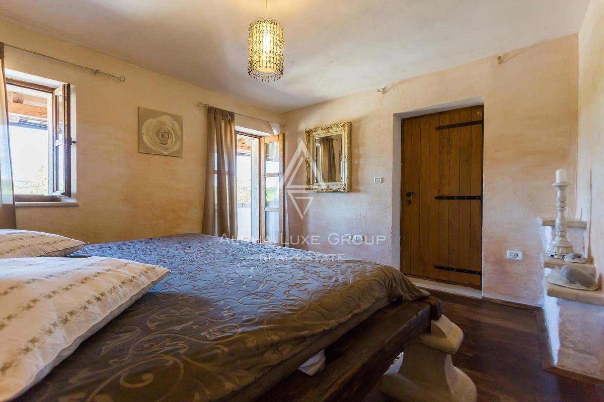 The property includes five spacious bedrooms, three bathrooms, a fully equipped kitchen, and a dining area adorned with a grand oak table, ideal for hosting gatherings. A cozy fireplace adds to the inviting ambiance, while stone floors and unique details like a stone sink with copper faucets enhance the villa’s rustic charm. Each room is equipped with air conditioning units and electric stone slabs for heating, and the bathrooms on the first floor feature underfloor heating for additional comfort.