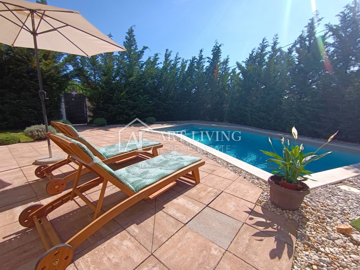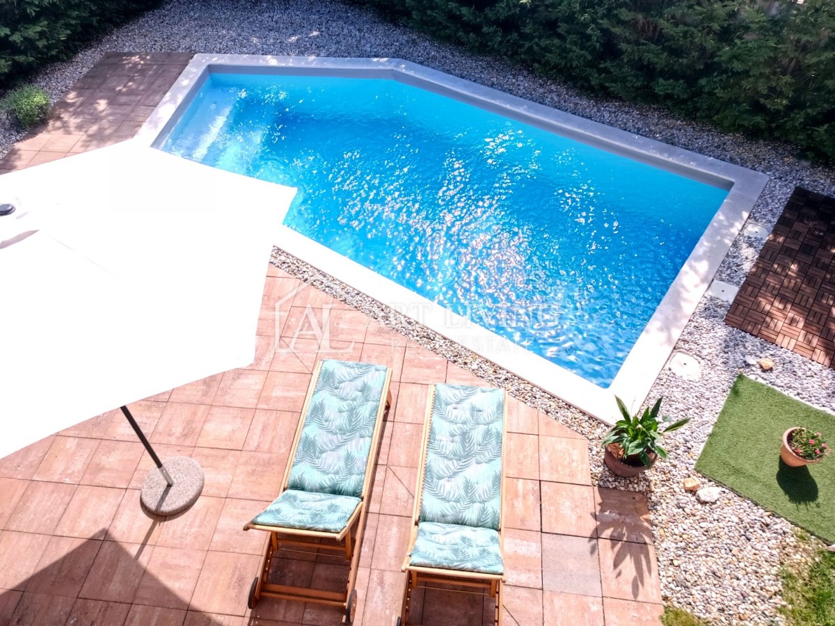 A beautiful pool of 28 m2 is located on the front side of the house, while on the side there is a landscaped and fenced garden with an outdoor fireplace.