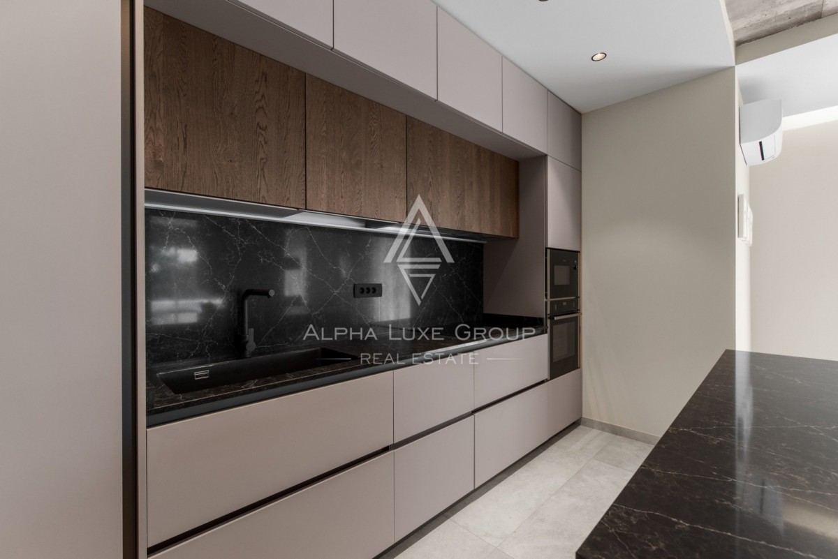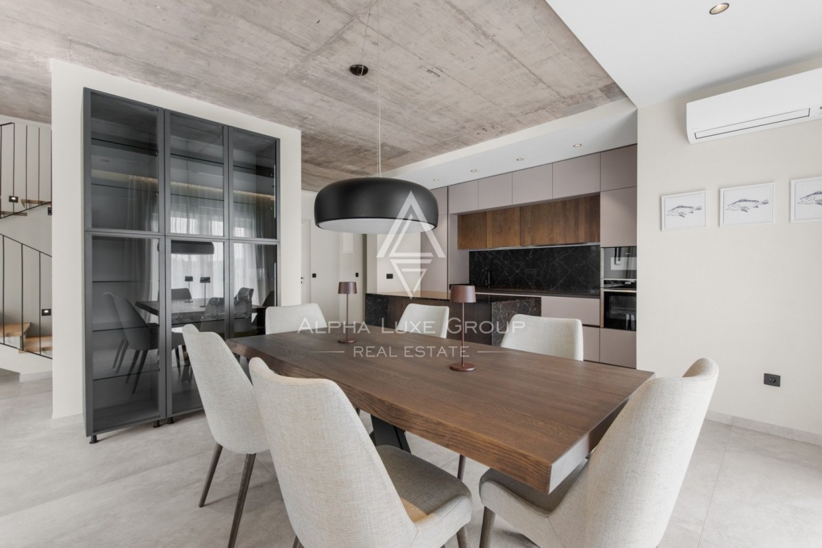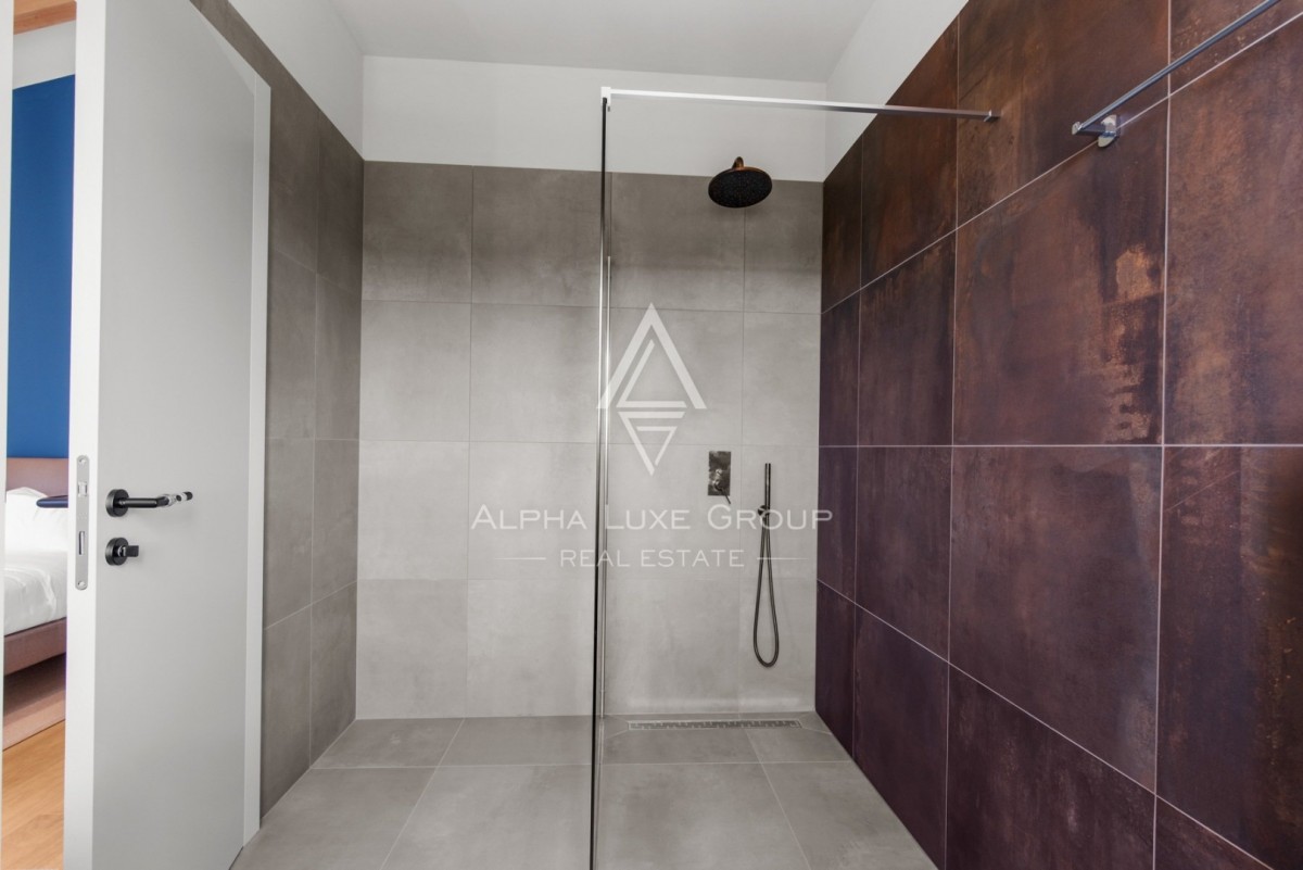 On the villa's ground floor, there is a spacious living room which, according to the open space concept, is connected to the luxuriously equipped kitchen and dining room. Large glass walls have been installed throughout the living room and dining room, allowing a lot of sunlight, giving the space a great light source.