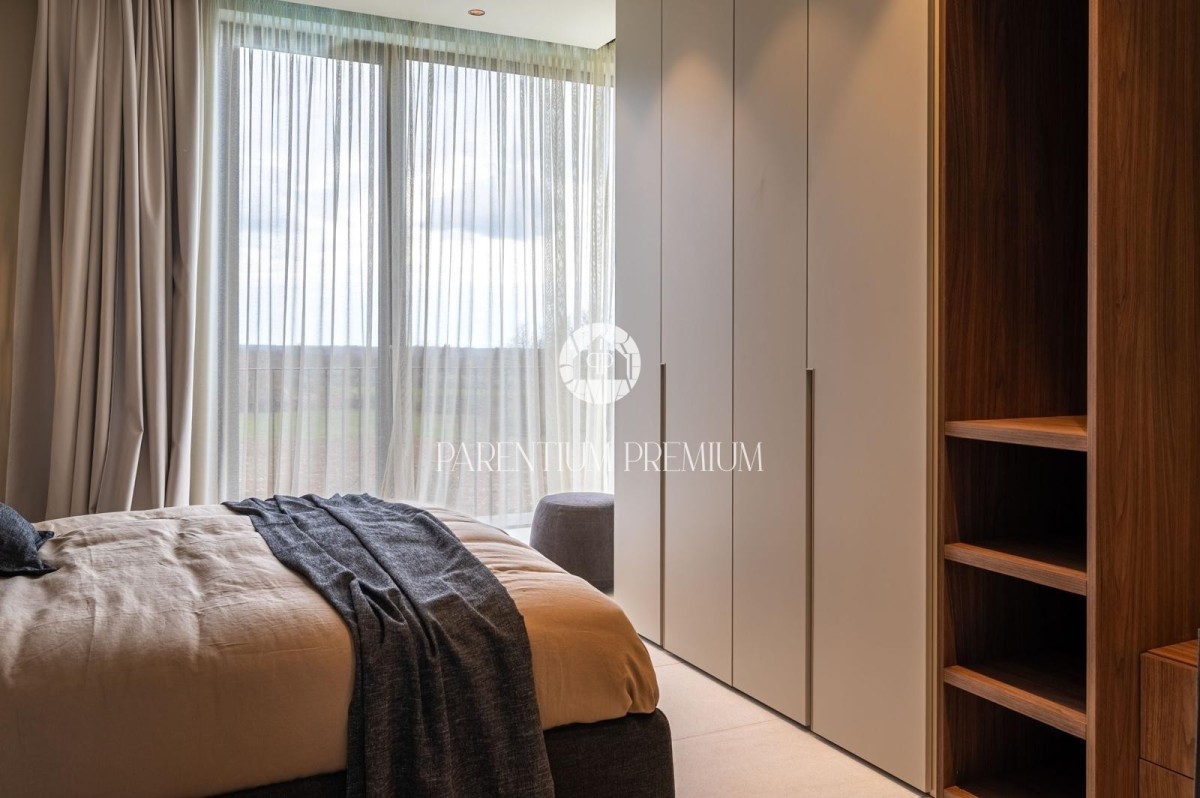 The interior is further enhanced by 280 cm high ceilings and WICONA aluminium windows and doors from floor to ceiling, providing exceptional brightness, spaciousness and uninterrupted views. A double curtain system – sheer curtains combined with blackout curtains – allows complete privacy and light control in all rooms.