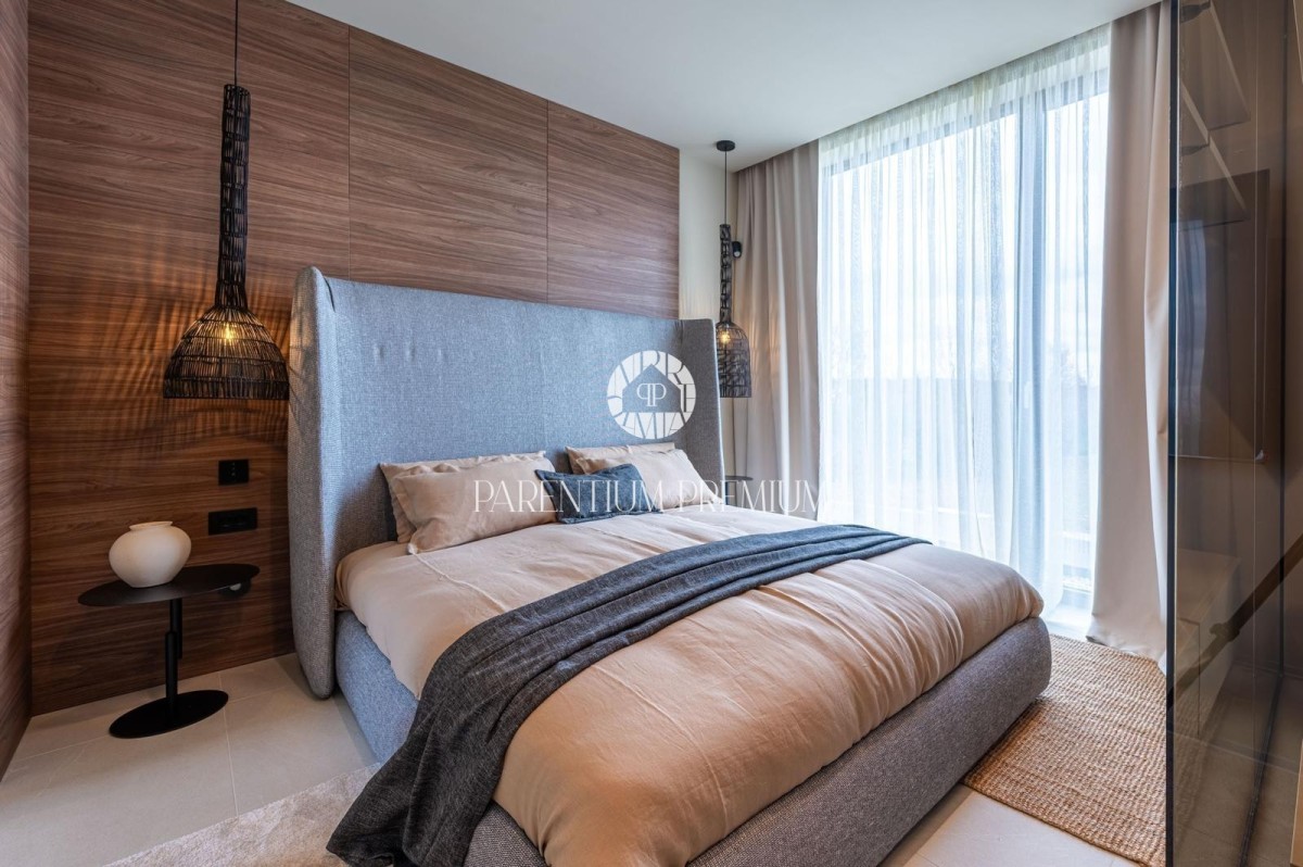 Special emphasis has been placed on technology and energy efficiency. The villa features a Loxone Smart Home system, Samsung WindFree air conditioning, underfloor heating and a heat pump. The STO façade system ensures excellent thermal insulation and long-term durability. Optical internet, video surveillance, alarm system and intercom are standard, while a Loxone electric vehicle charging station further adapts the property to modern living.