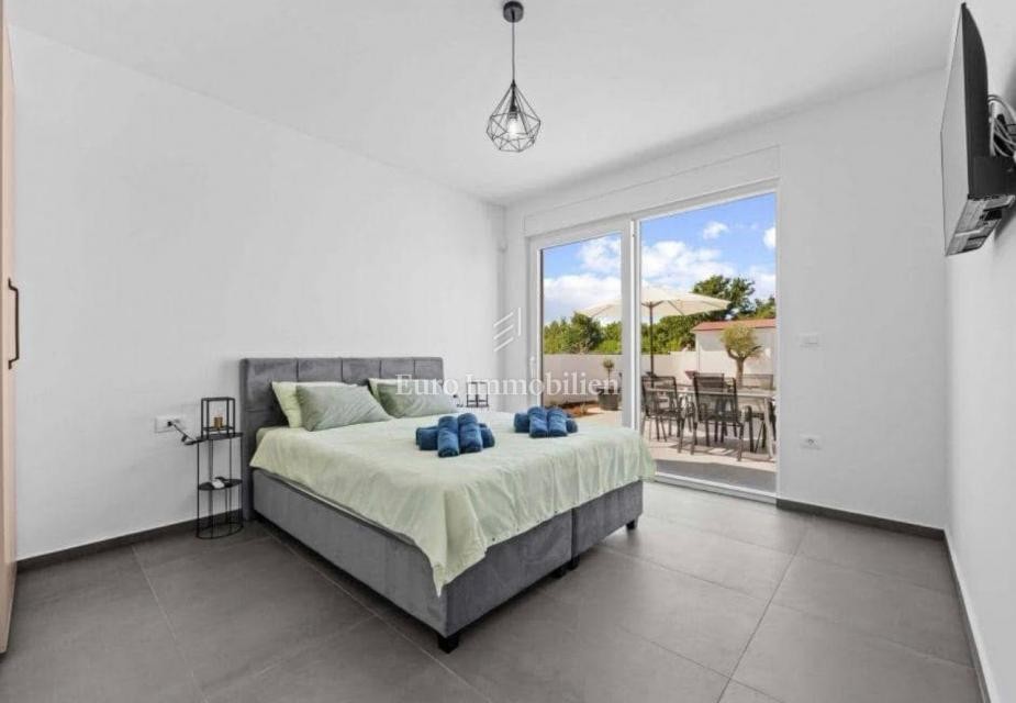 The villa is situated on a 692 m² plot and offers 139 m² of living space. It consists of an entrance hallway, a spacious open-plan living room with kitchen and dining area, three bedrooms and three bathrooms. Two bedrooms have direct access to the garden and pool. The house also includes a guest WC with laundry area and a technical room.