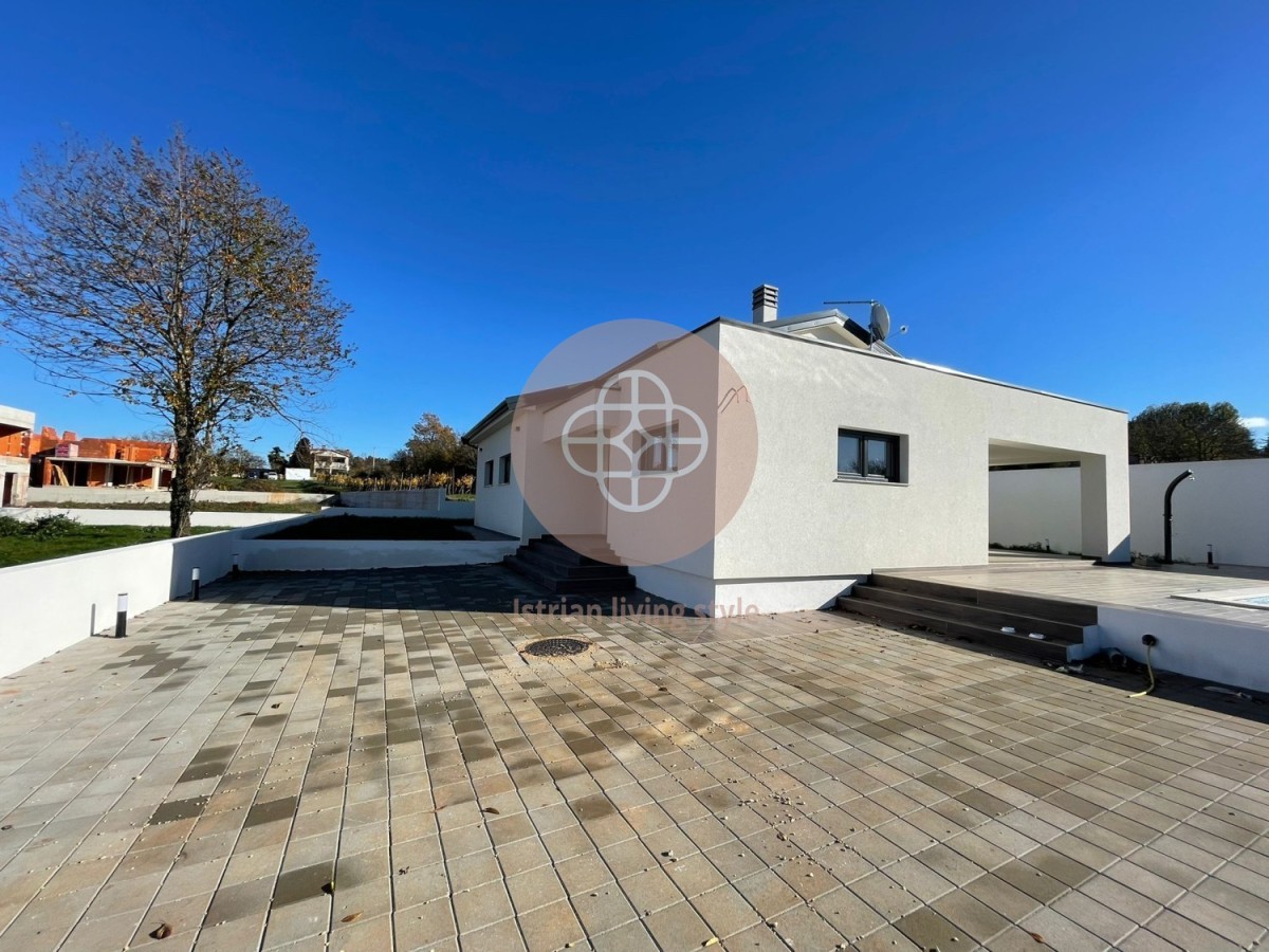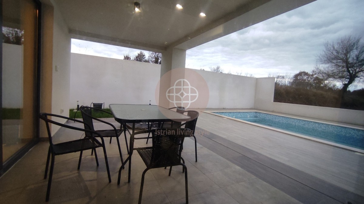 On the outskirts of Zartinj in a newly built area located vacation villa with 3 bedrooms each with attached bathroom. The living area consists of an open fully equipped kitchen with a separate technical room for washing machine, etc.. In the living/dining area is a