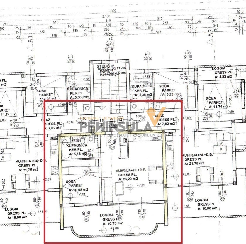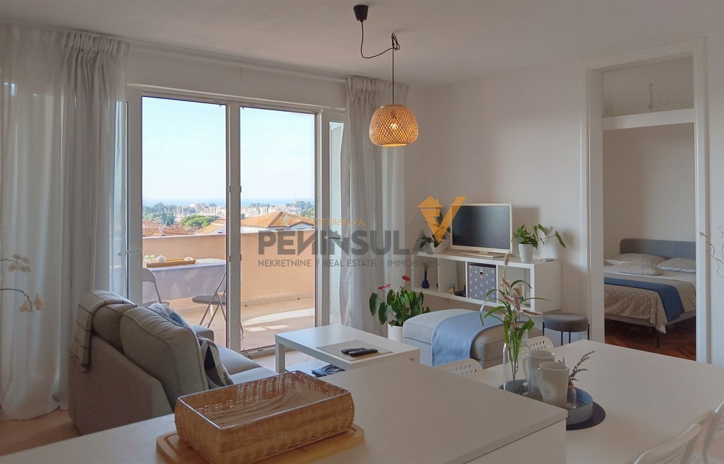 For sale is a one-bedroom apartment located 700 meters from the sea and a well-maintained beach, and 1200 meters from the city center. The apartment is situated on the second floor of a residential building with a total of nine units. The layout includes a bathroom, a bedroom, and an open-plan space with a kitchen, dining area, and living room. The living room opens onto a spacious 17 m² terrace, offering a stunning sea view.