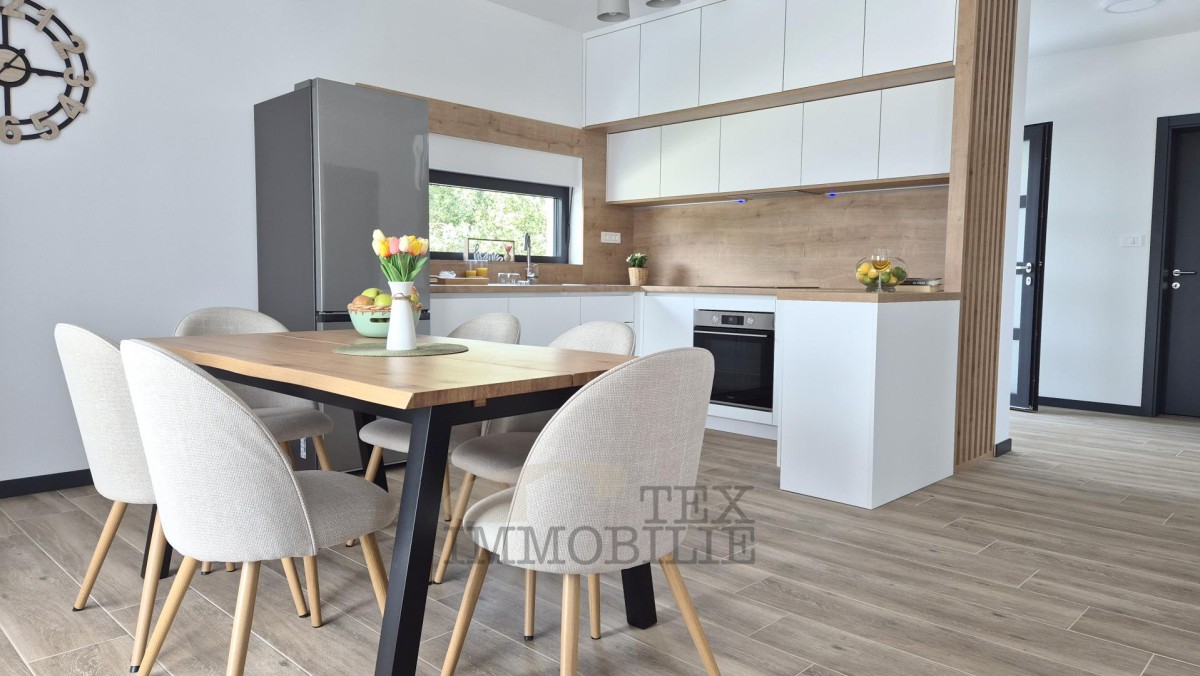 The villa features the first phase of underfloor heating (heat pump) and inverter air conditioning in all rooms. The courtyard offers a swimming pool with a sunbathing area and a summer kitchen – perfect for relaxing and enjoying sunny days.