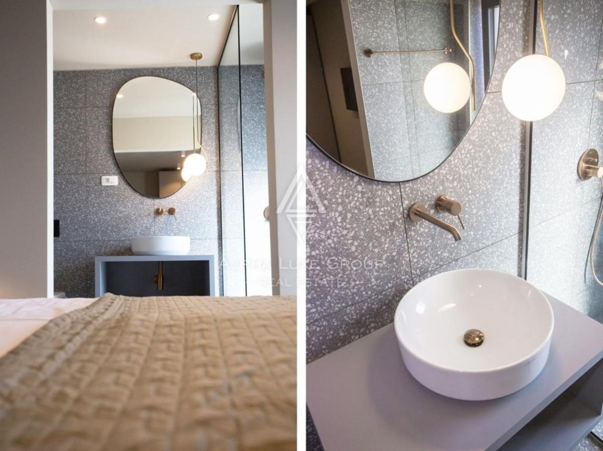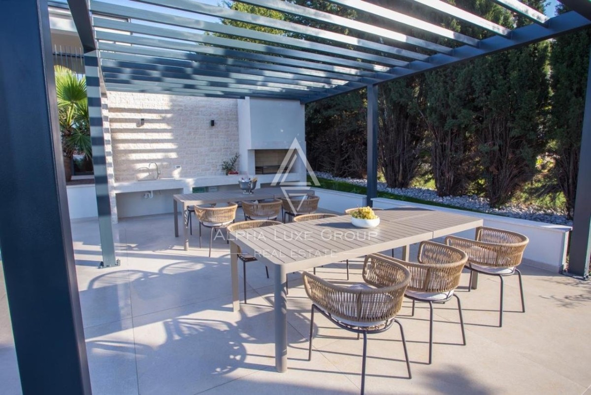 High-end Italian furnishings, elite Catalano and Grohe bathroom fixtures, and a comprehensive security system underscore the villa's commitment to unmatched luxury. Embrace warmth during cooler months with the heat pump, underfloor heating, and individual air conditioners. This fully-furnished paradise, set amidst a verdant expanse of 1753 m2, features towering palms, cypresses, a 40 m2 heated pool, and parking for eight. An outdoor summer kitchen spanning 35 m2 accentuates the estate's charm. While it promises a tranquil personal haven, its potential as a lucrative summer rental cannot be overlooked.