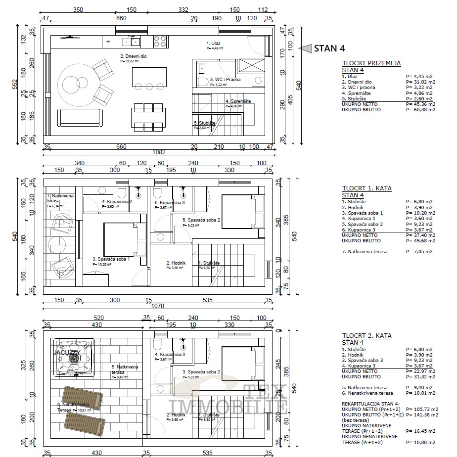 This apartment spans across all three floors of the building and has a net area of 105 m2.