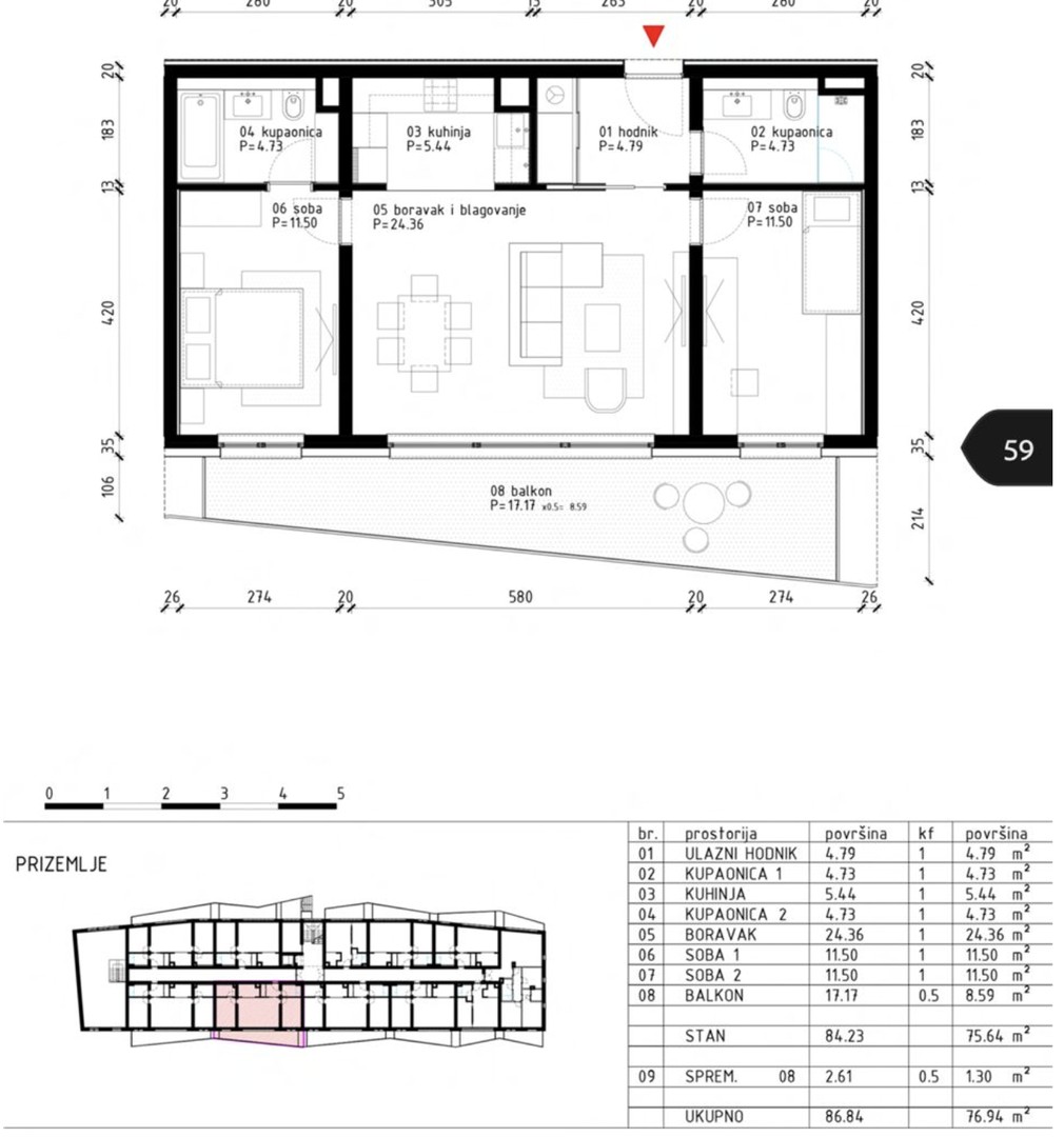 An apartment is for sale in Poreč, 2.5-room (2BR+DB), with a NET usable area of 76.94 m2 (GROSS area 86.63 m2), located on the raised ground floor of a residential building. This apartment offers modern architecture and a high standard of construction.