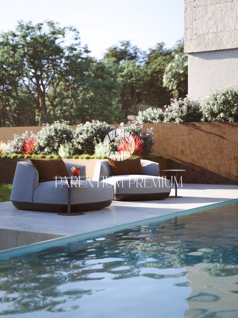 The net living area of the house is 223.8 m². In the garden, a swimming pool with a sun deck is planned, offering a panoramic sea view – perfect for relaxation and leisure.