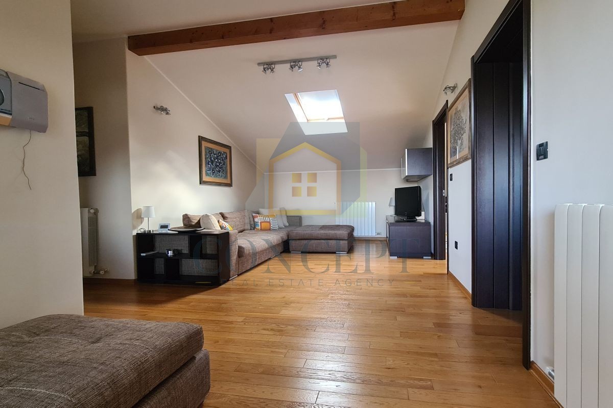 The rooftop terrace with an awning is ideal for outdoor living. The apartment is equipped with air conditioning and radiators, and the price includes a parking space in front of the building.