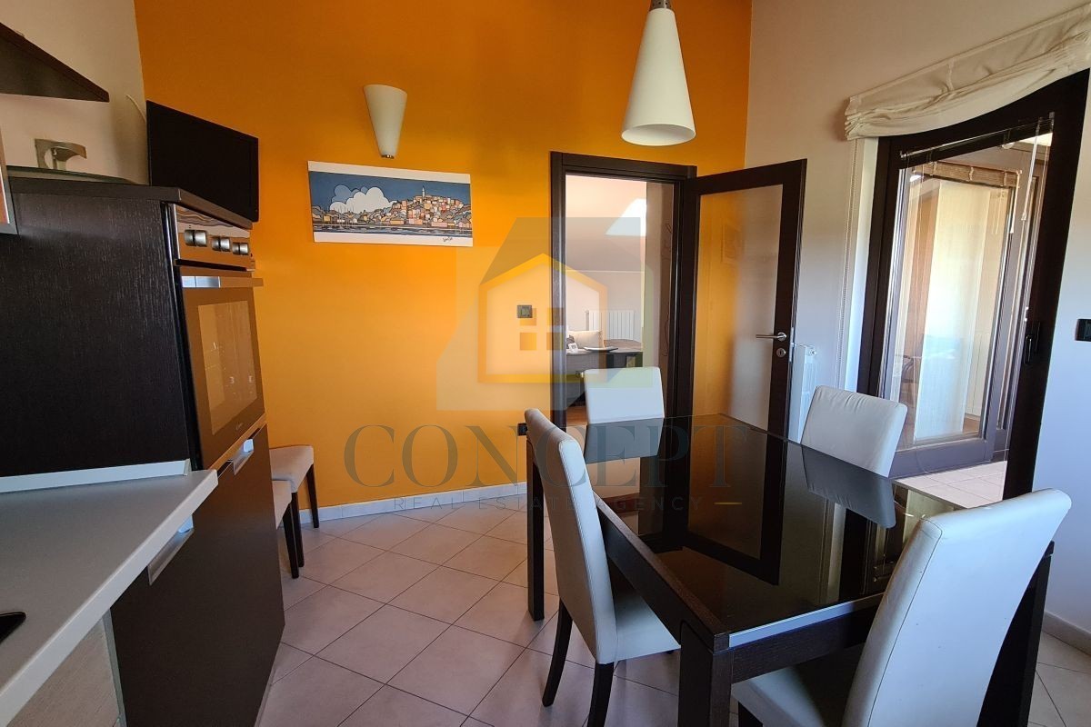 The apartment offers a beautiful view of the old town of Vrsar and the sea. It consists of a bright living room with access to the rooftop terrace, a kitchen, two bedrooms, one of which has a walk-in closet and the other a balcony, and a bathroom with a shower, toilet, and bidet.