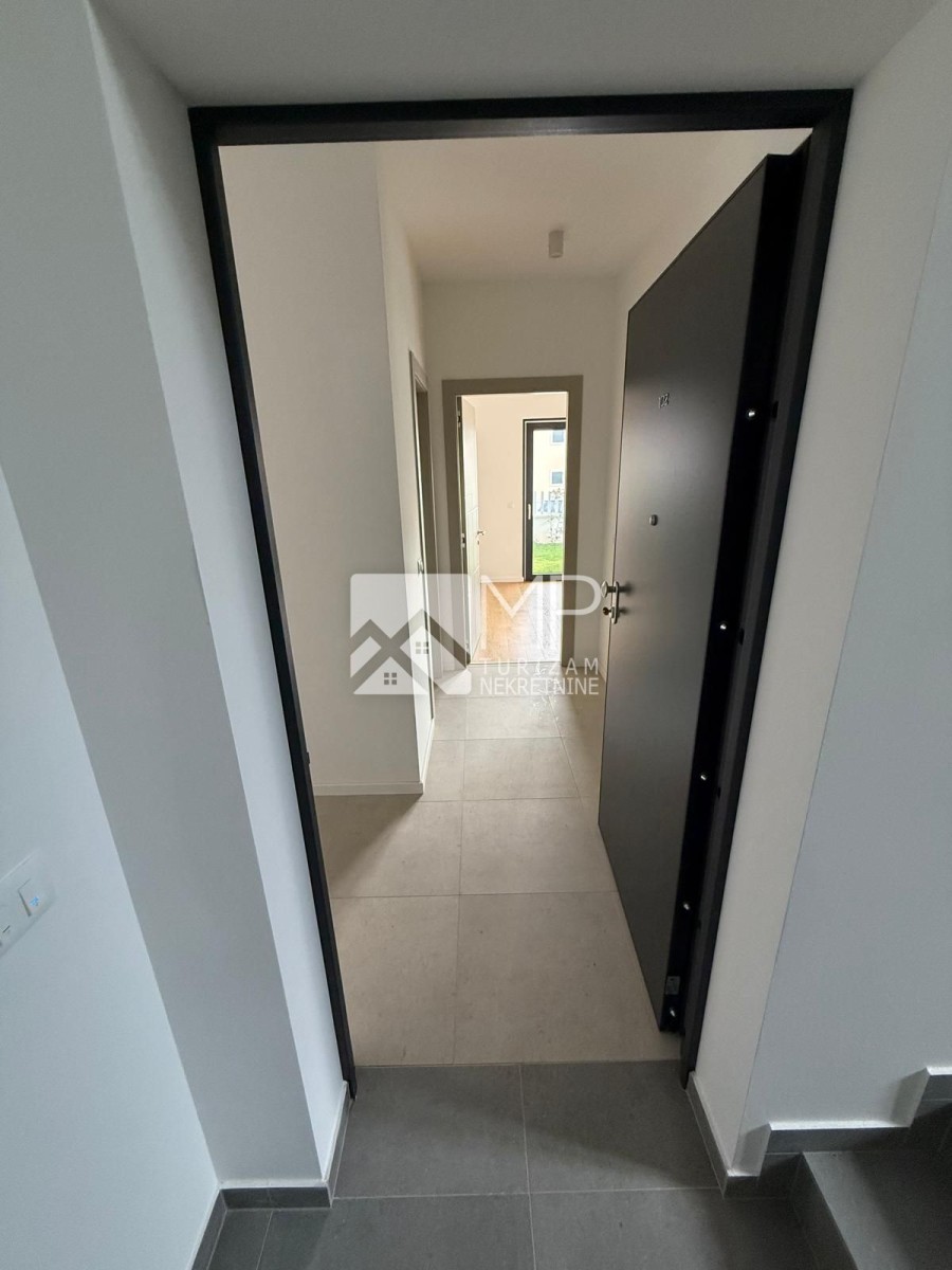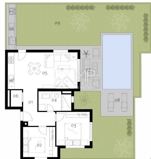 The apartment in question marked "101" – 55.90 m2 is located on the ground floor of the building, and consists of: entrance hall, living room + kitchen + dining room, two bedrooms and bathroom, and a spacious garden of about 200 m2, where the swimming pool is located.