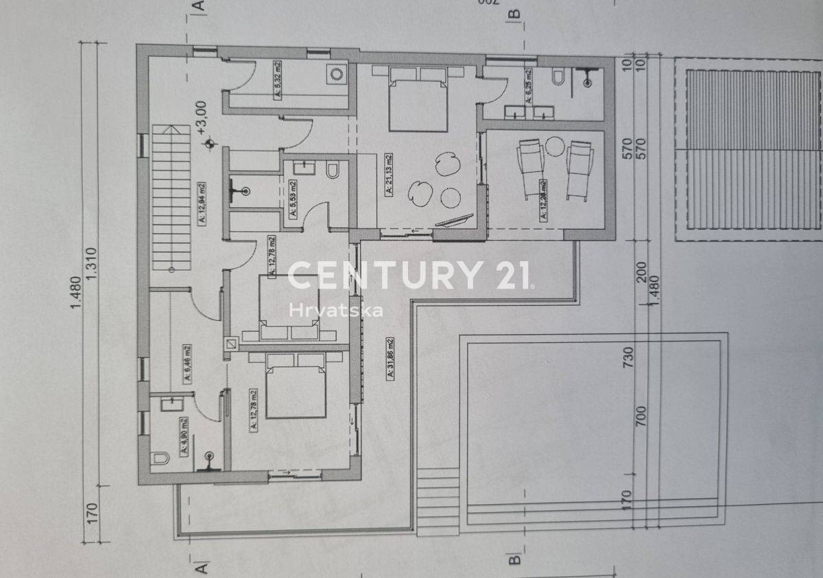 Upstairs there are three more bedrooms with their own bathrooms. One room has a loggia where you can place a jacuzzi for two people, and all rooms have access to a spacious balcony of 31.86 m2.