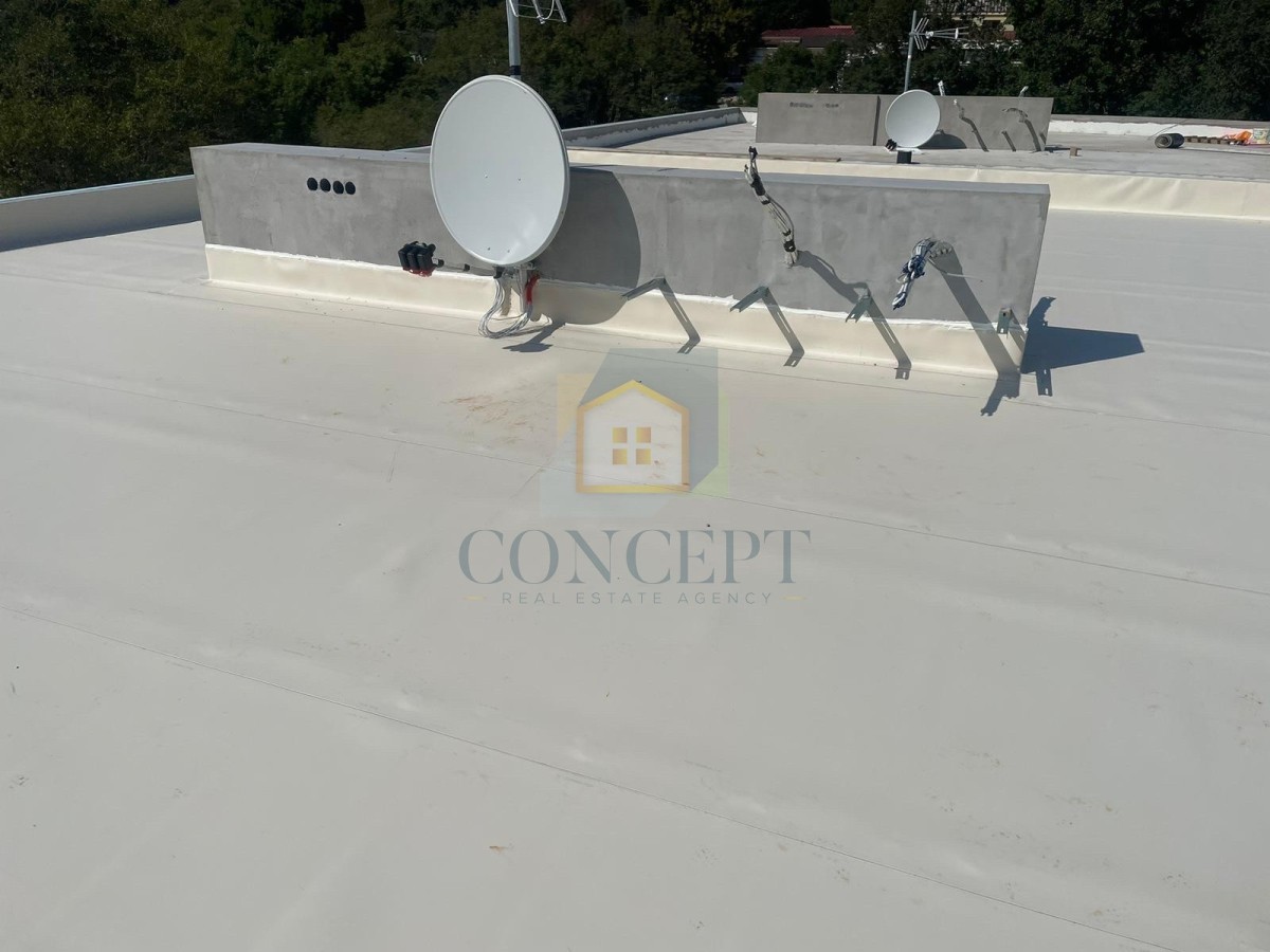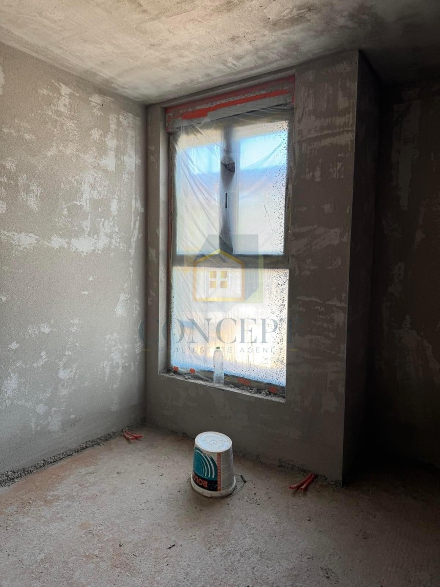 The apartment will be equipped with high-quality materials. Heating and cooling will be provided by a MultiSplit system, and underfloor heating will be installed in the bathroom and kitchen. The floors will be covered with Italian tiles, while the bedrooms will have wooden flooring. Large glass portals will be made of white PVC with external aluminum cladding in anthracite color, triple glazing, and aluminum shutters with electric lifts. The facade of the building will be executed using a thermal insulation system with decorative stone elements.