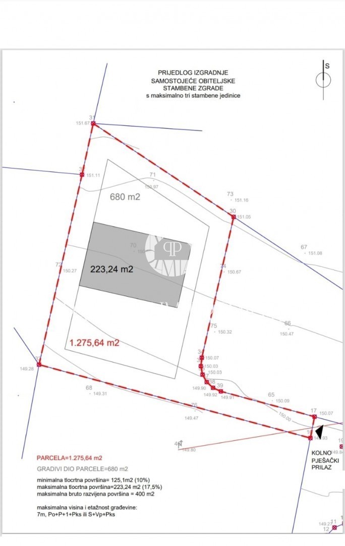 The land has a total surface area of 1,276 m², with electricity and water connections on the plot, allowing for a quick and straightforward project realization. There is a possibility to build a property with three residential units.